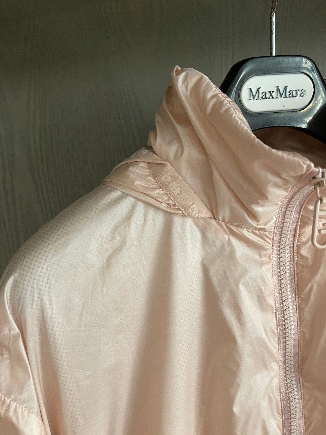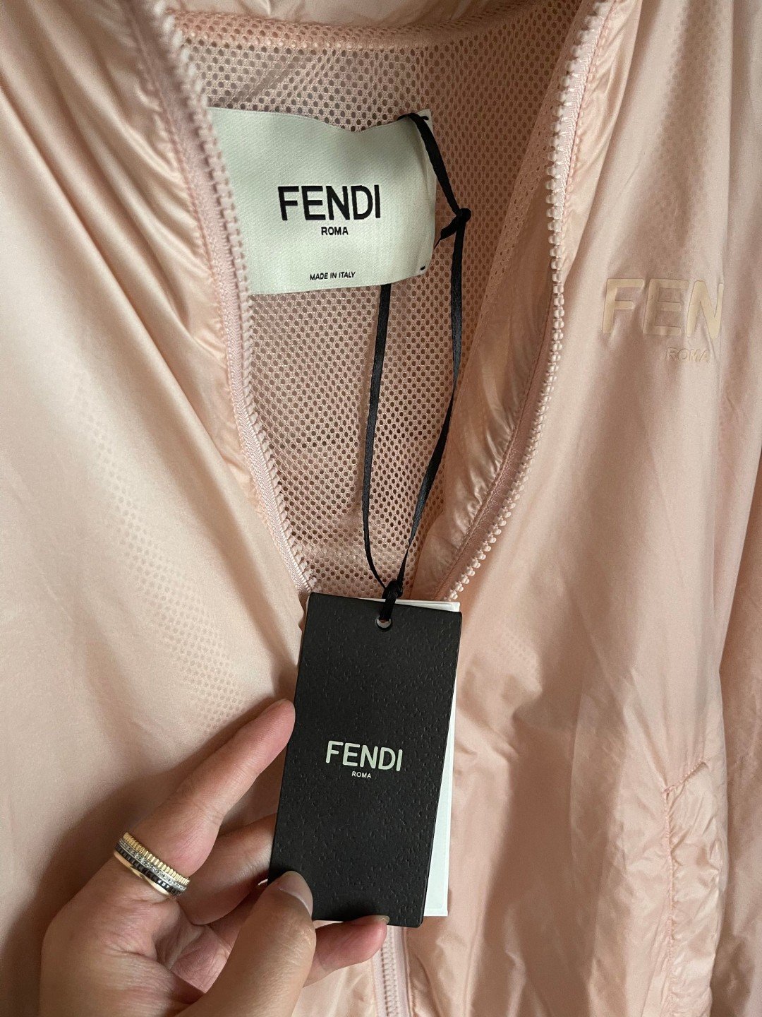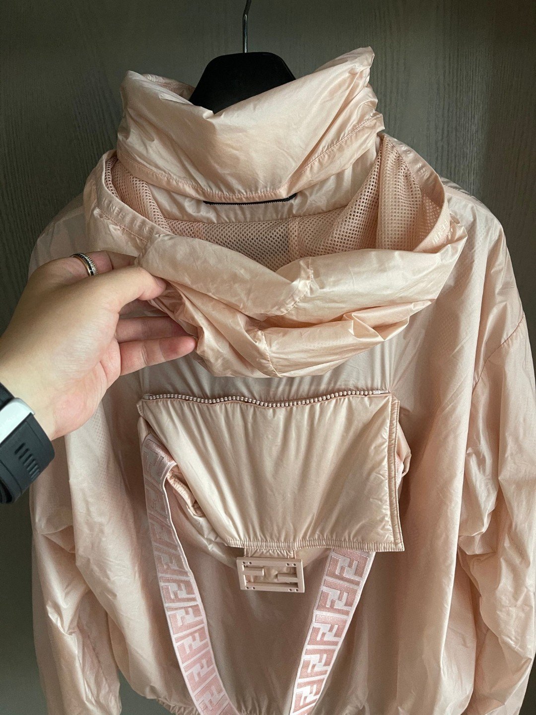 夹克配有抽绳兜帽和侧拉链口袋。后腰部有内部抽绳,罗纹袖口。拉链开合,配有同色系双拉头。采用柔软材质制成,表面光滑。腰部侧带带有金色金属 FF 扣。