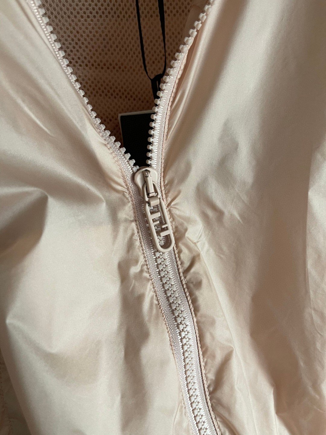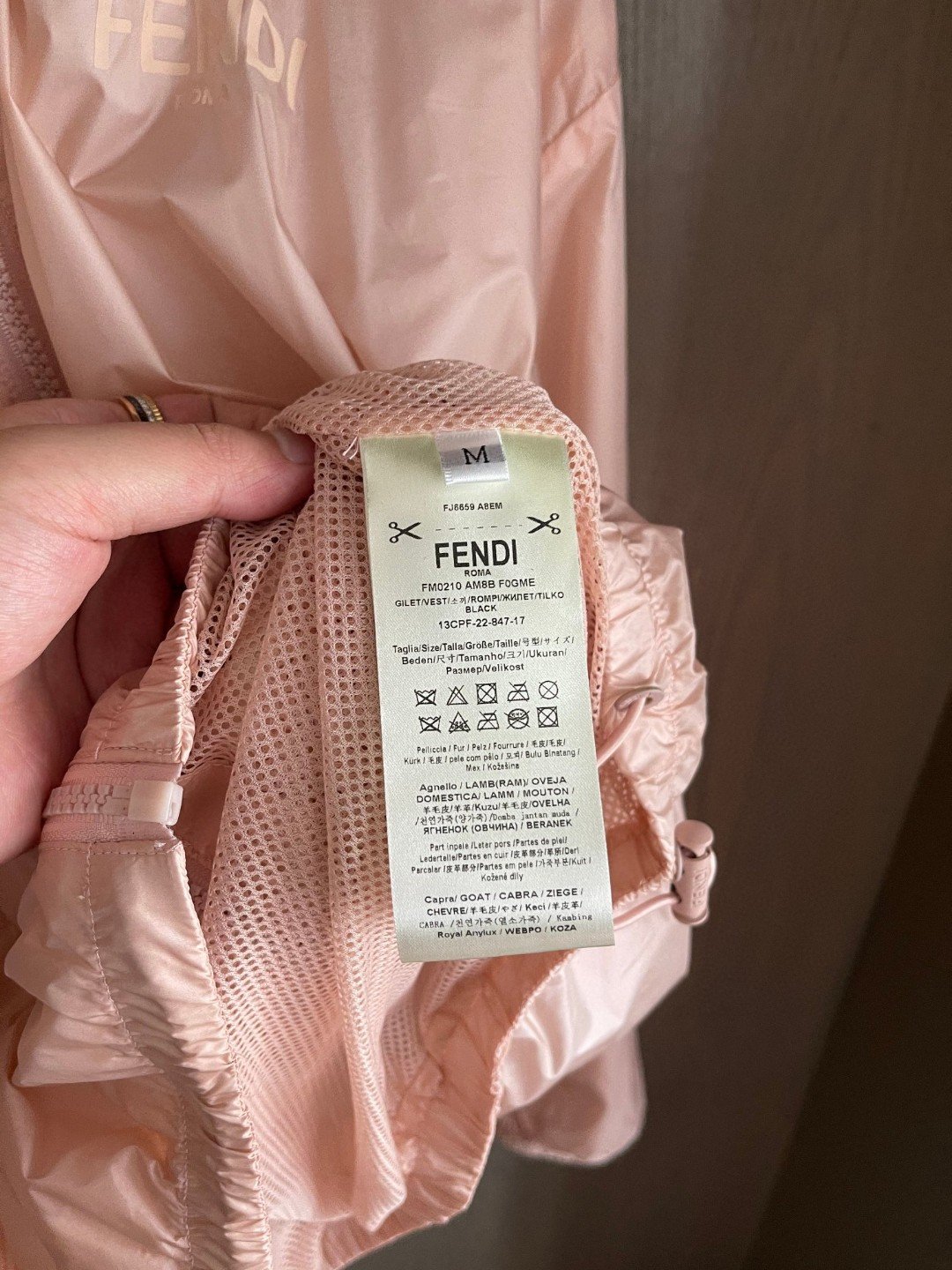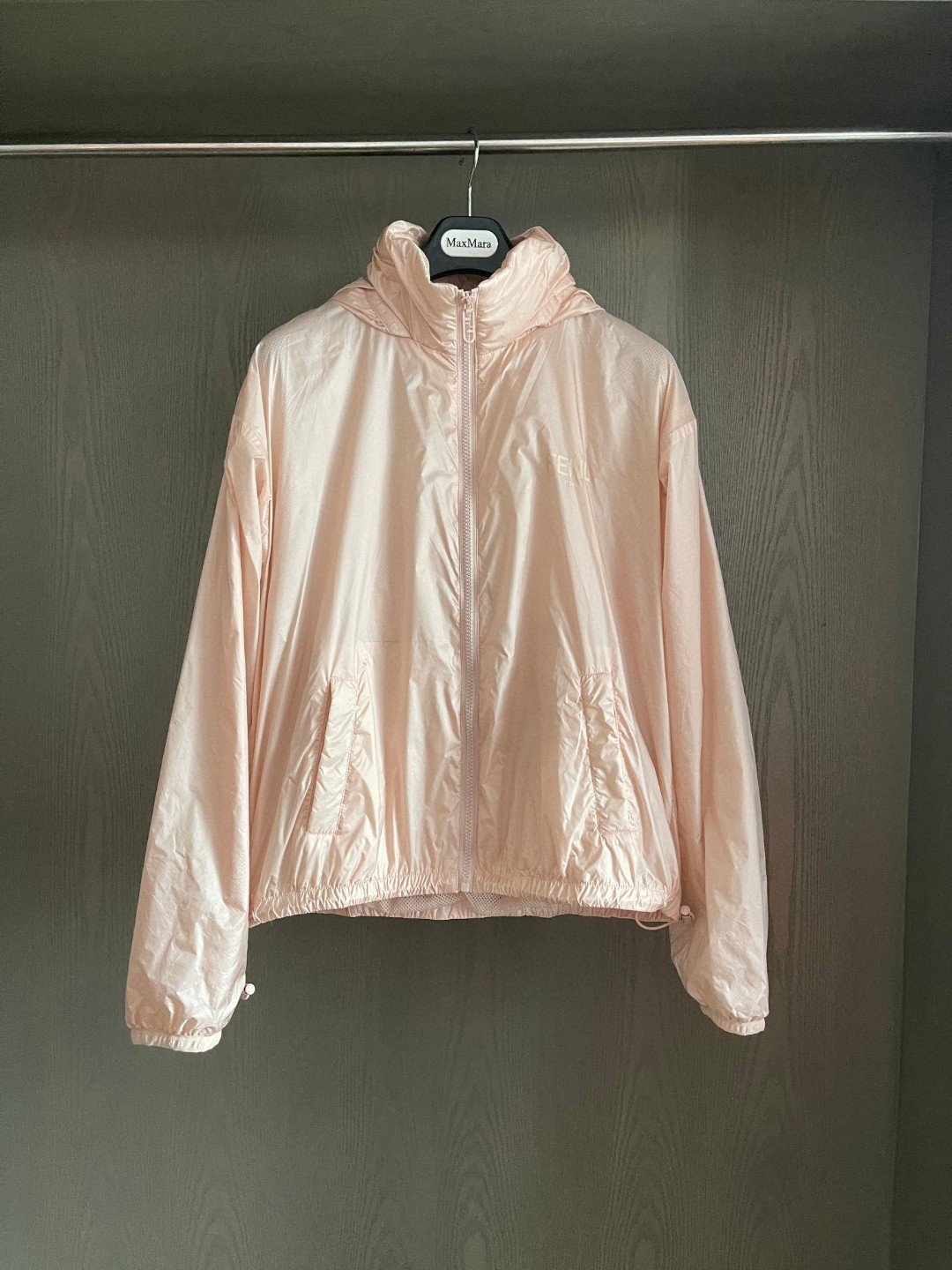 夹克配有抽绳兜帽和侧拉链口袋。后腰部有内部抽绳,罗纹袖口。拉链开合,配有同色系双拉头。采用柔软材质制成,表面光滑。腰部侧带带有金色金属 FF 扣。