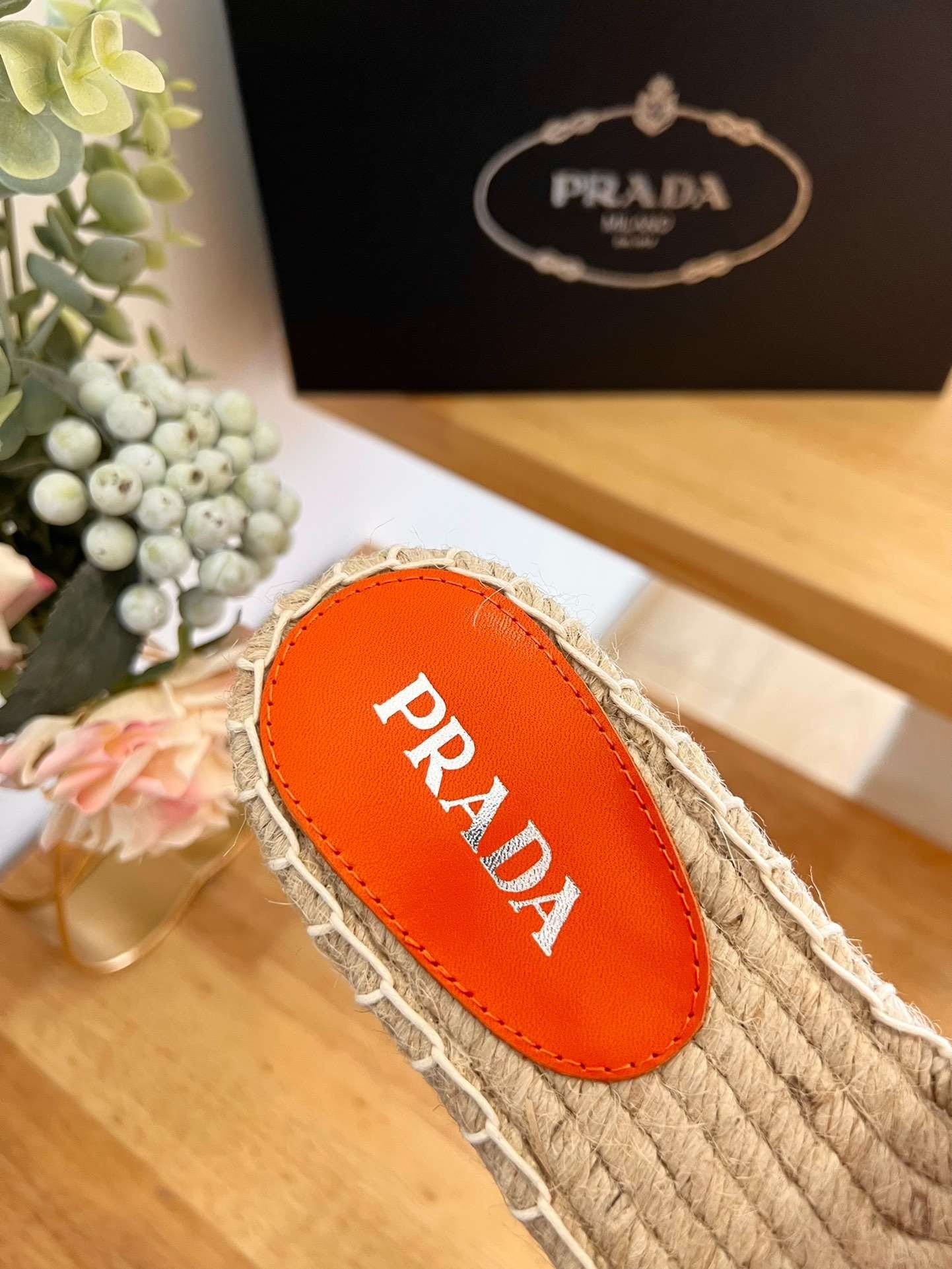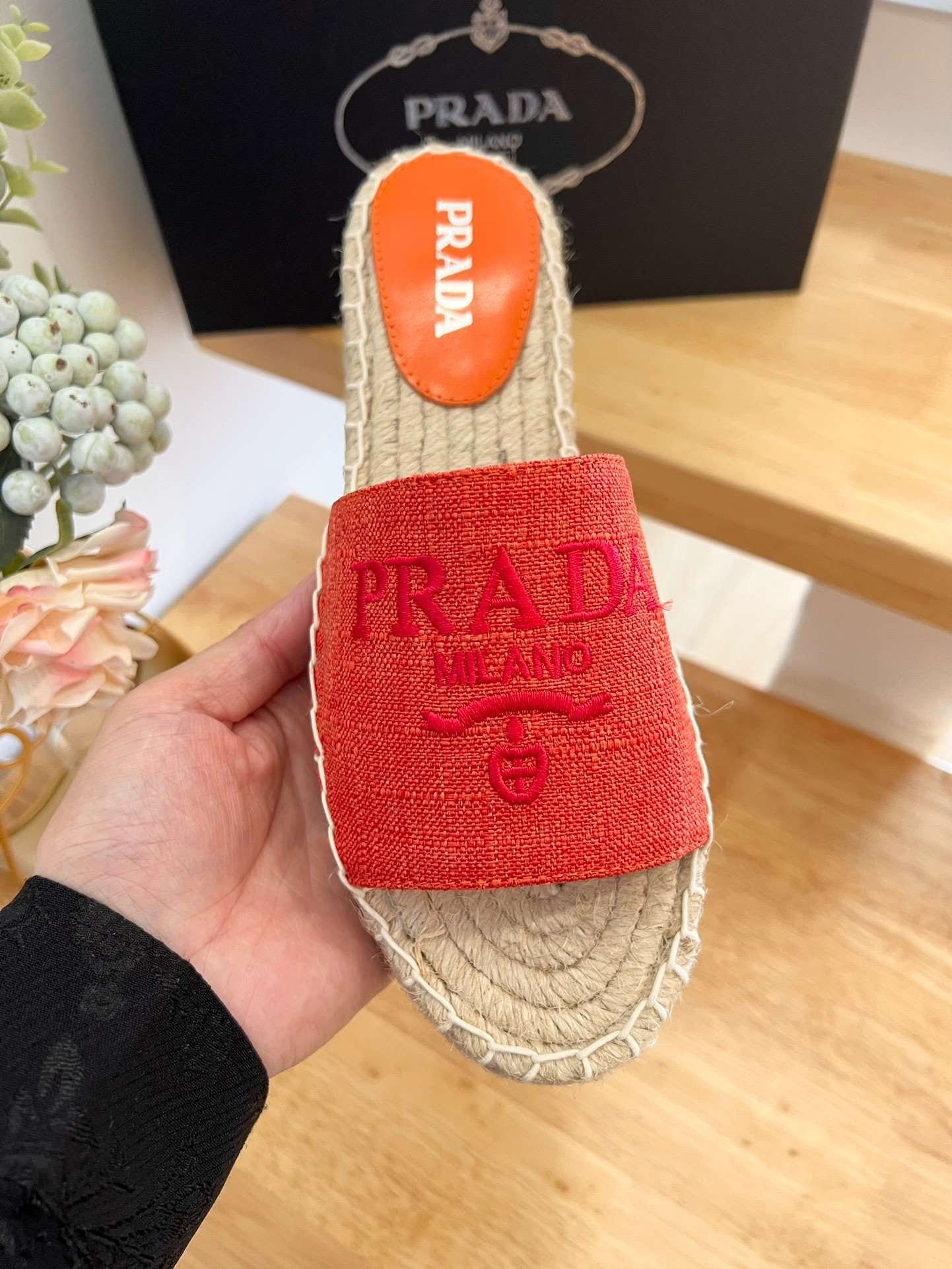 Prada 标志性三角形徽标为这些织物麻底拖鞋的设计增添了三维元素。绳索和橡胶鞋底是这款鞋的特点,充满精致魅力,让人想起夏天。