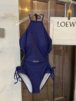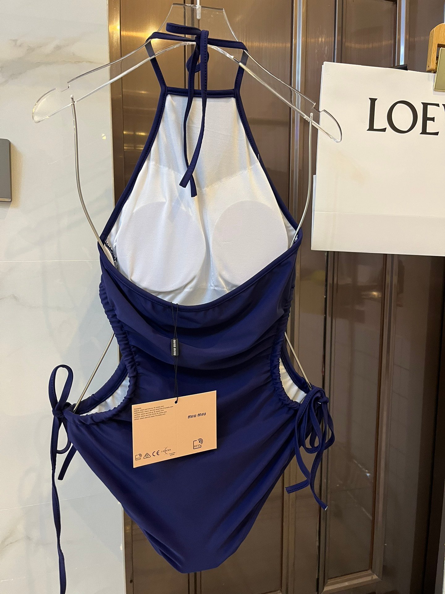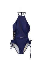 熟悉的连体泳衣造型,腰部剪裁营造出酷感,吊带背心造型,颈部系带,颈部系带裤子的腰部。