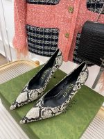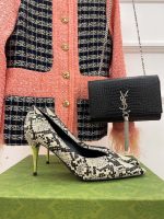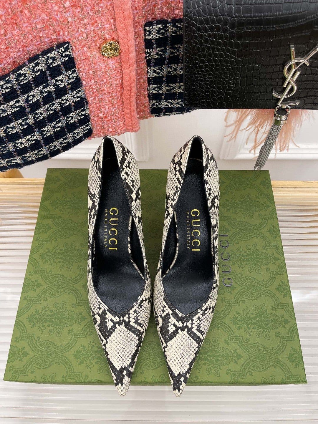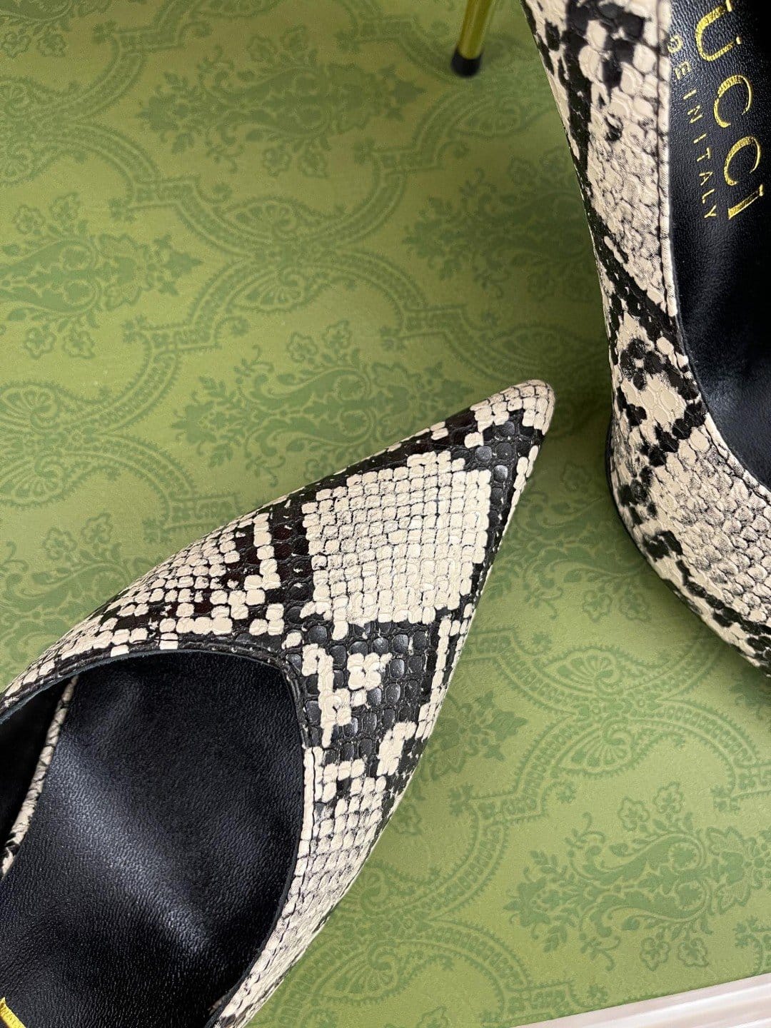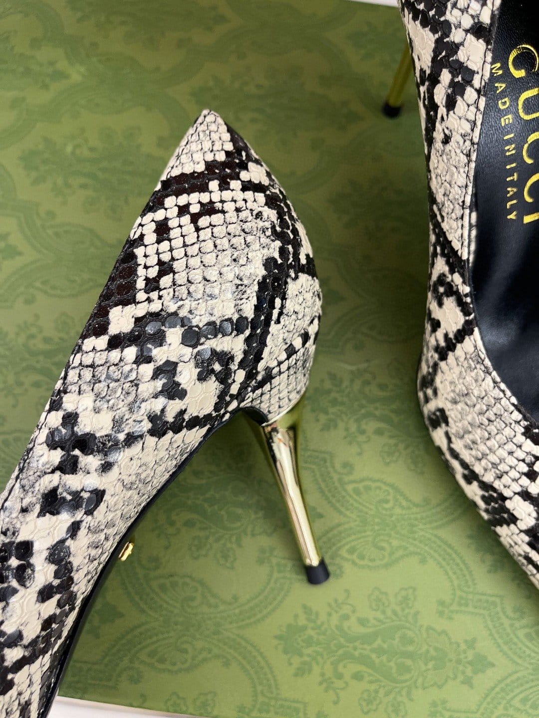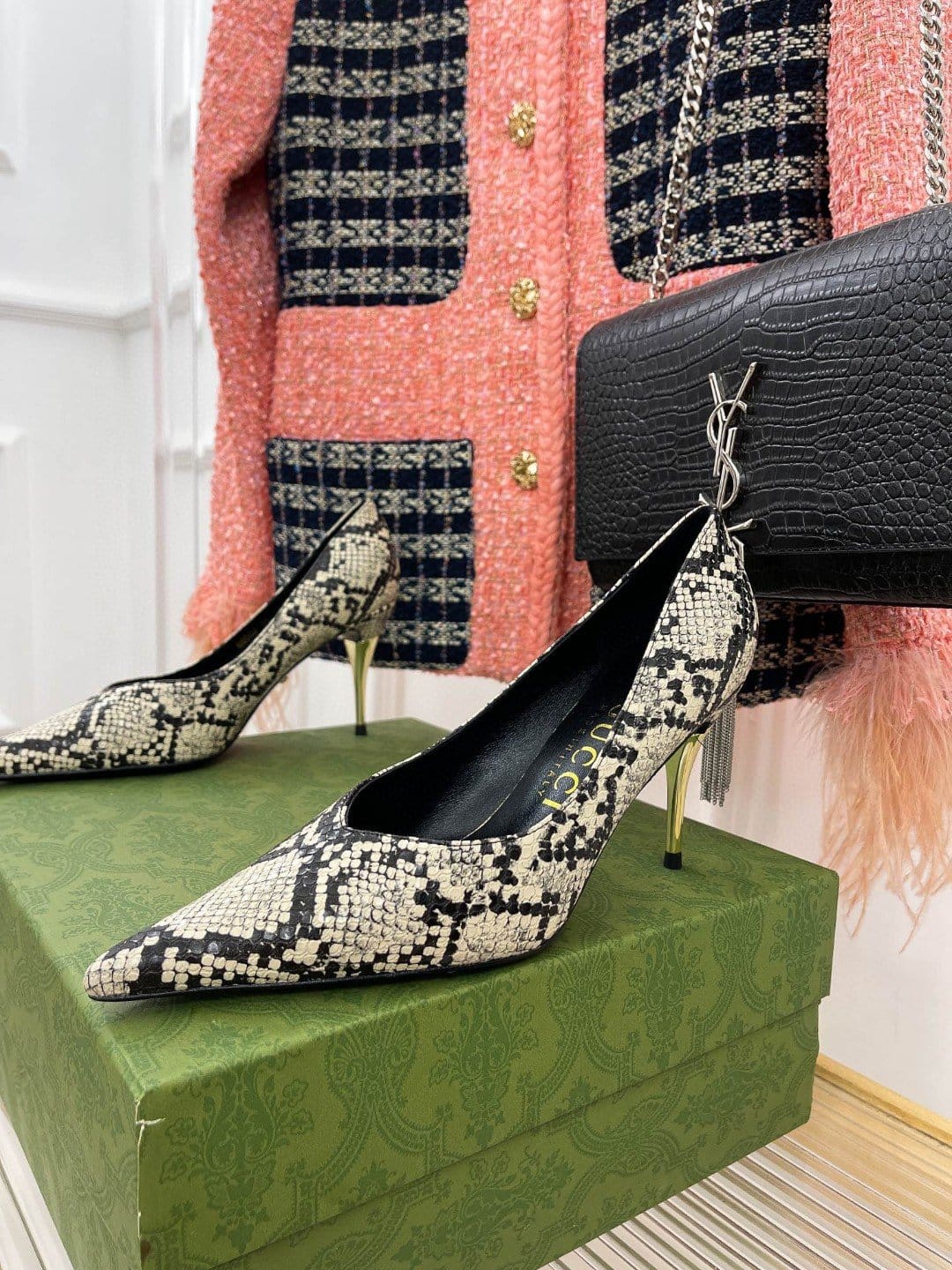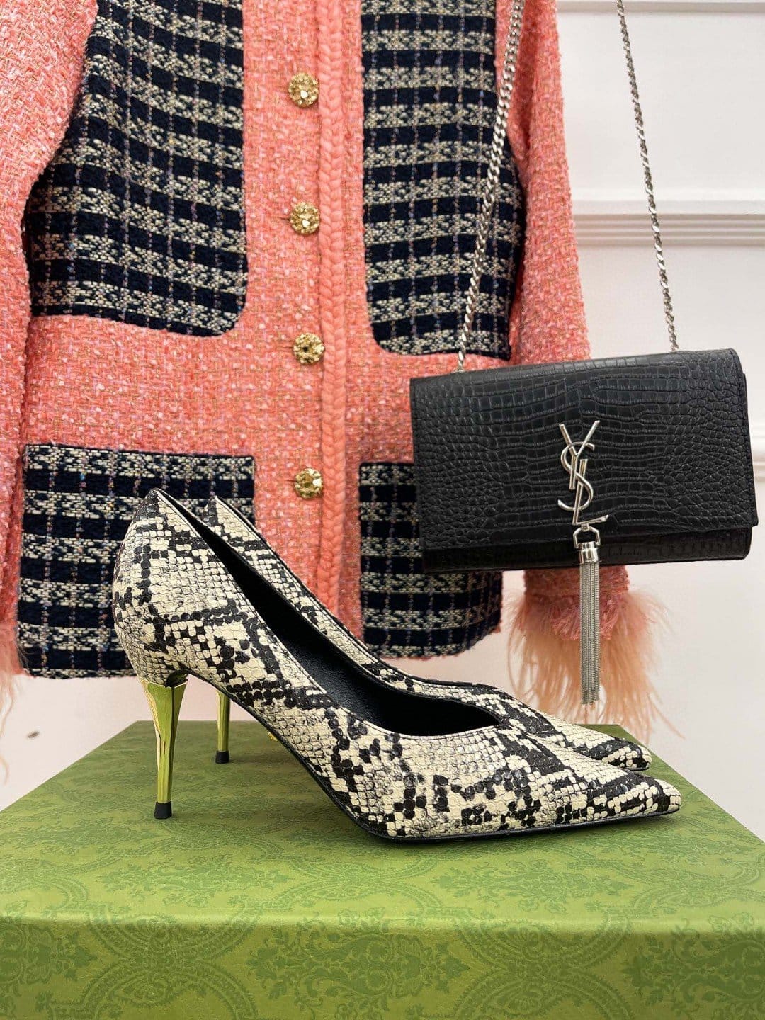 这双高跟鞋是对经典廓形的演绎,其特点是金属细高跟,营造出现代感。尖头完成设计。