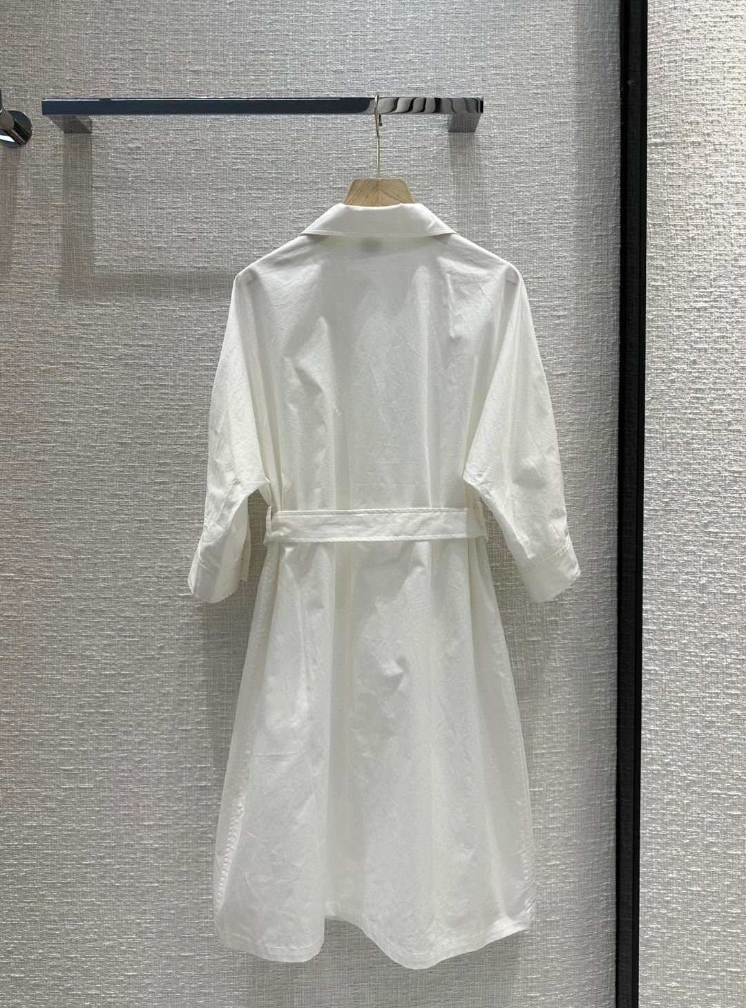 斜纹布腰带连衣裙,经典衣领,正面隐藏式纽扣,饰有珍珠母纽扣,前袋和袖口饰有 Chaine d’Ancre 纽扣,腰部配有打结腰带。