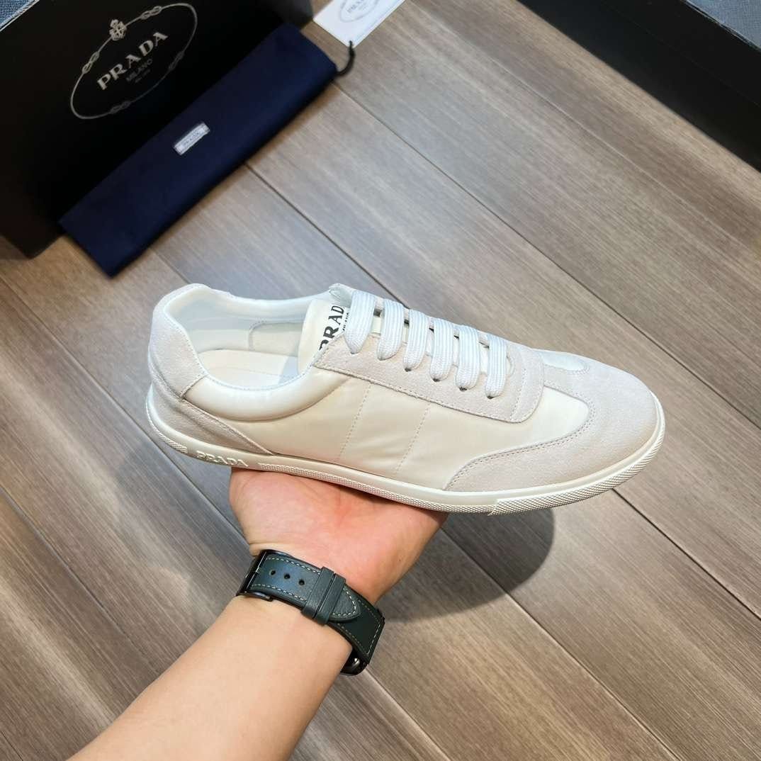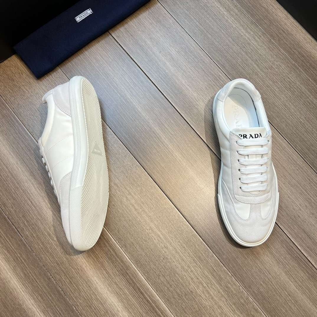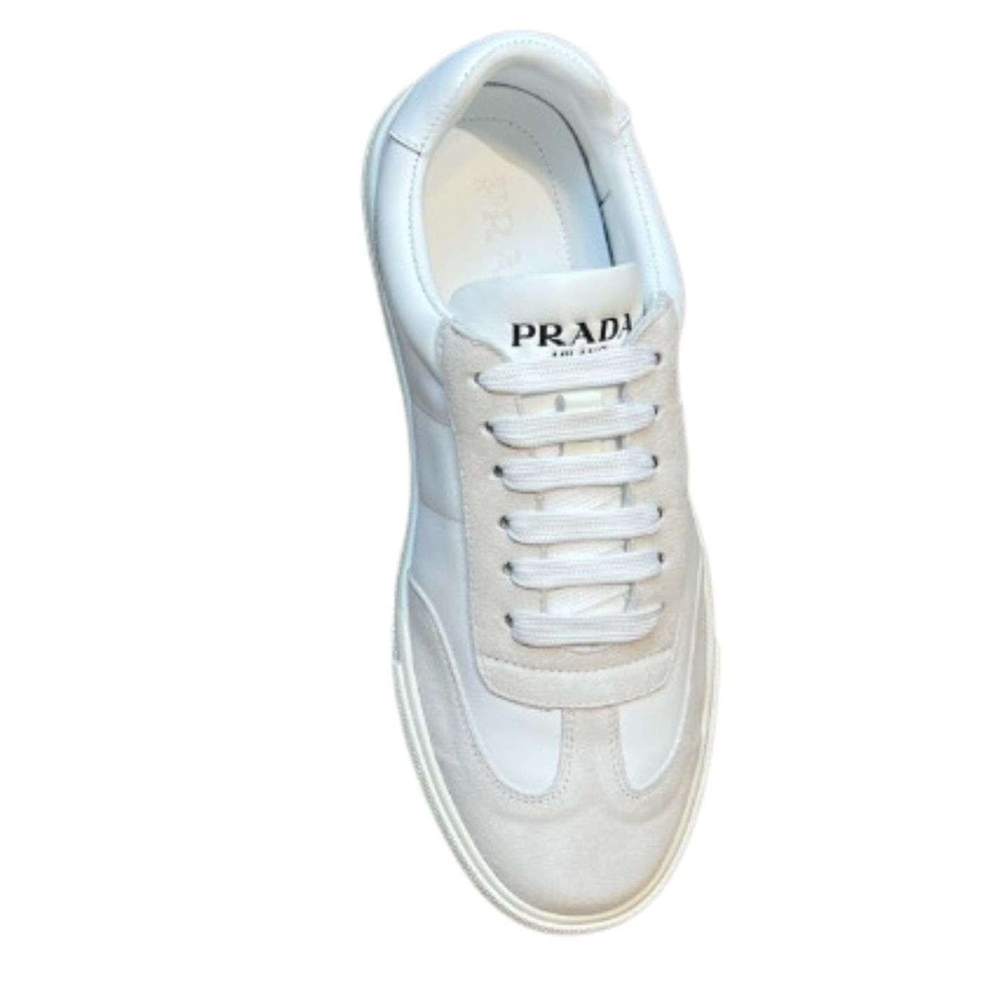 鞋舌上沿着浅色橡胶鞋底出现的 Prada 徽标的不同诠释丰富了这款运动鞋。