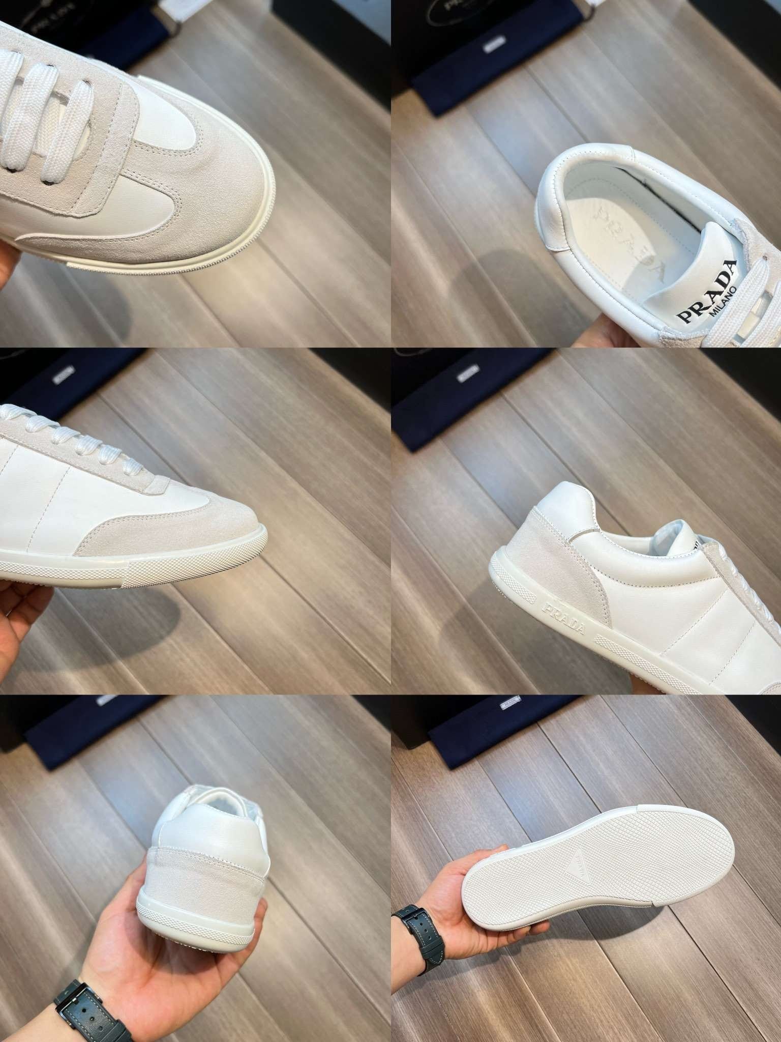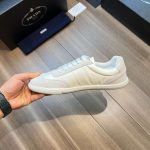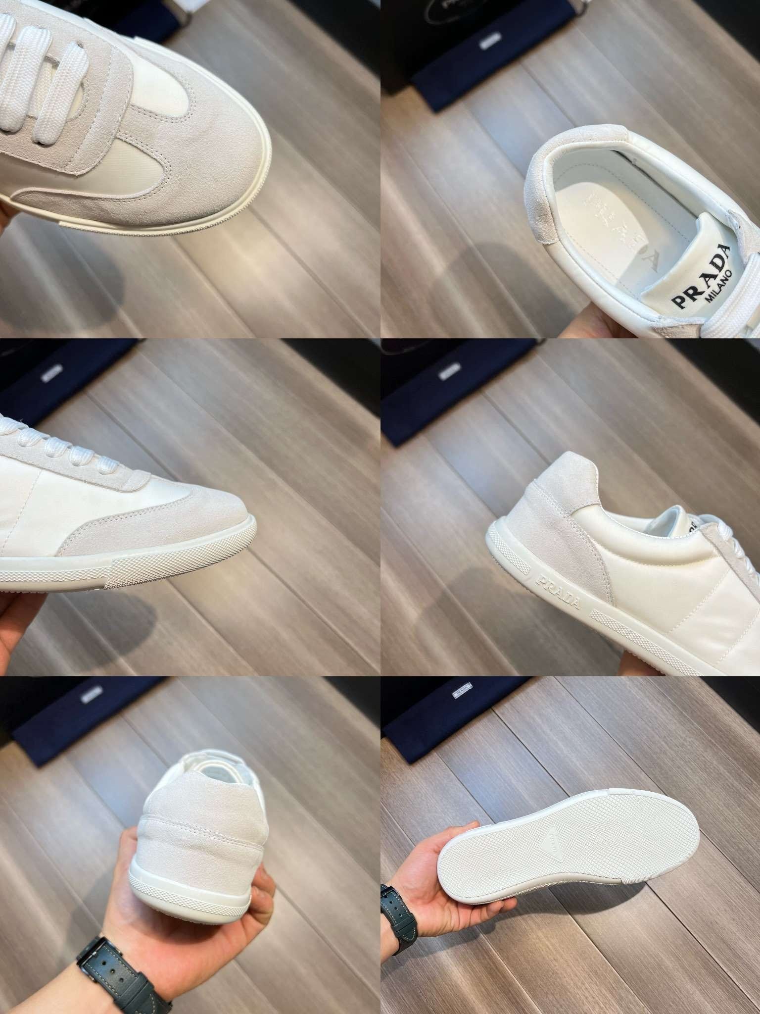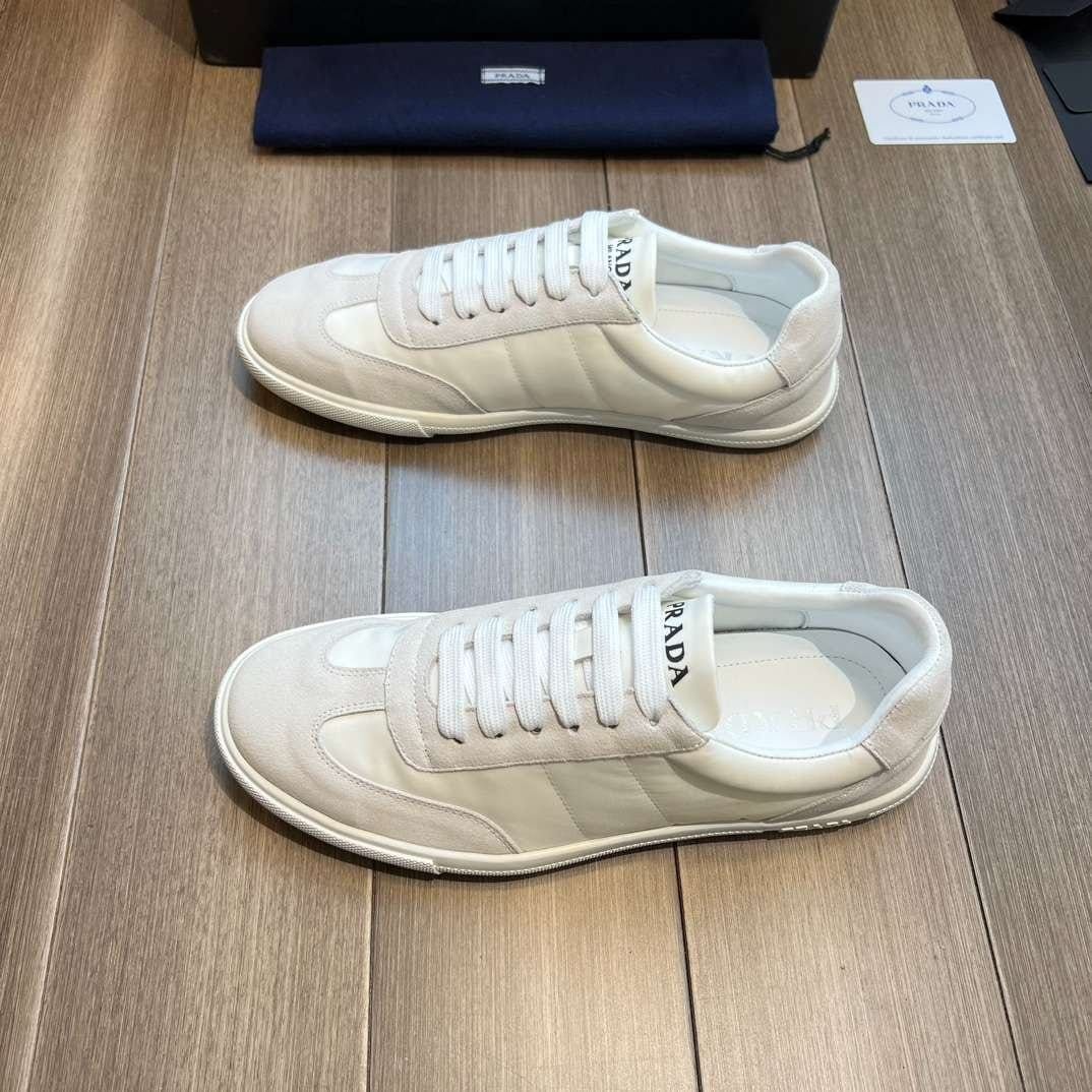 鞋舌上沿着浅色橡胶鞋底出现的 Prada 徽标的不同诠释丰富了这款运动鞋。
