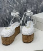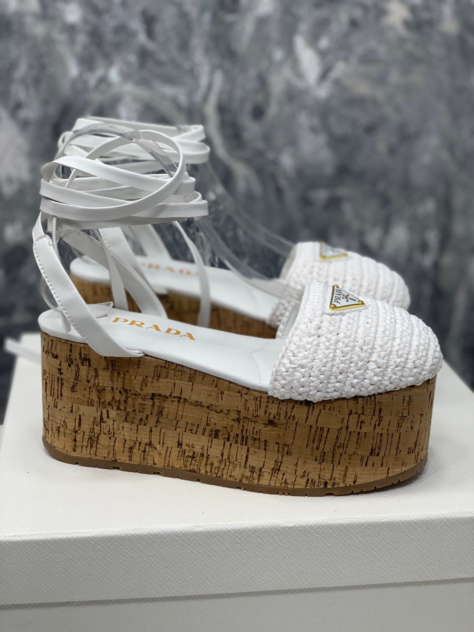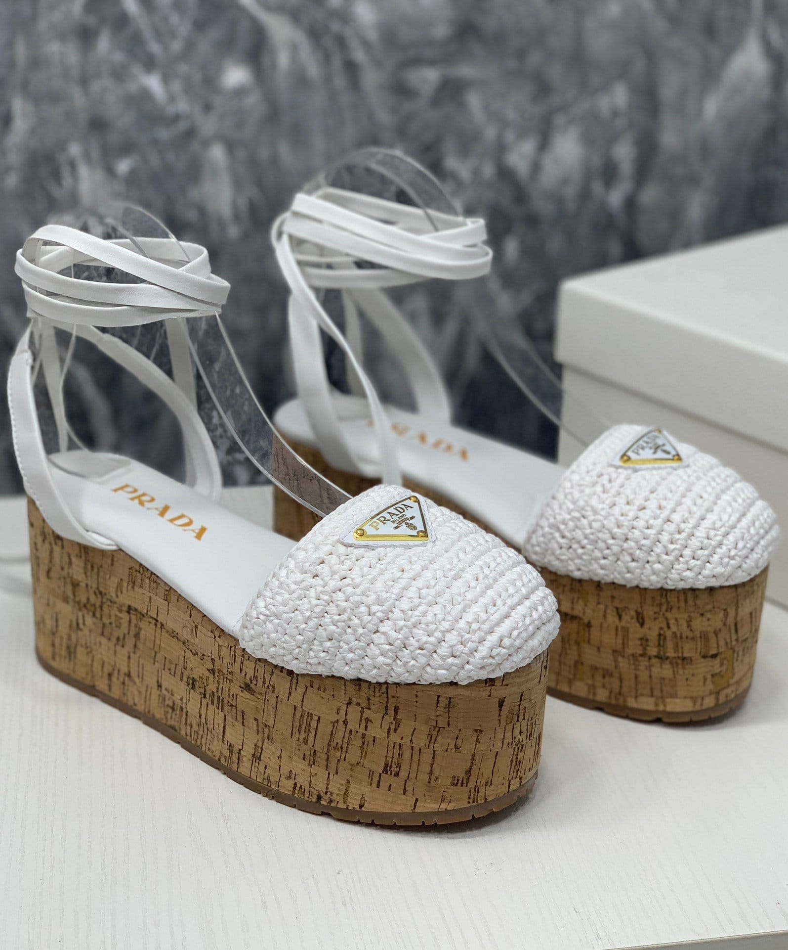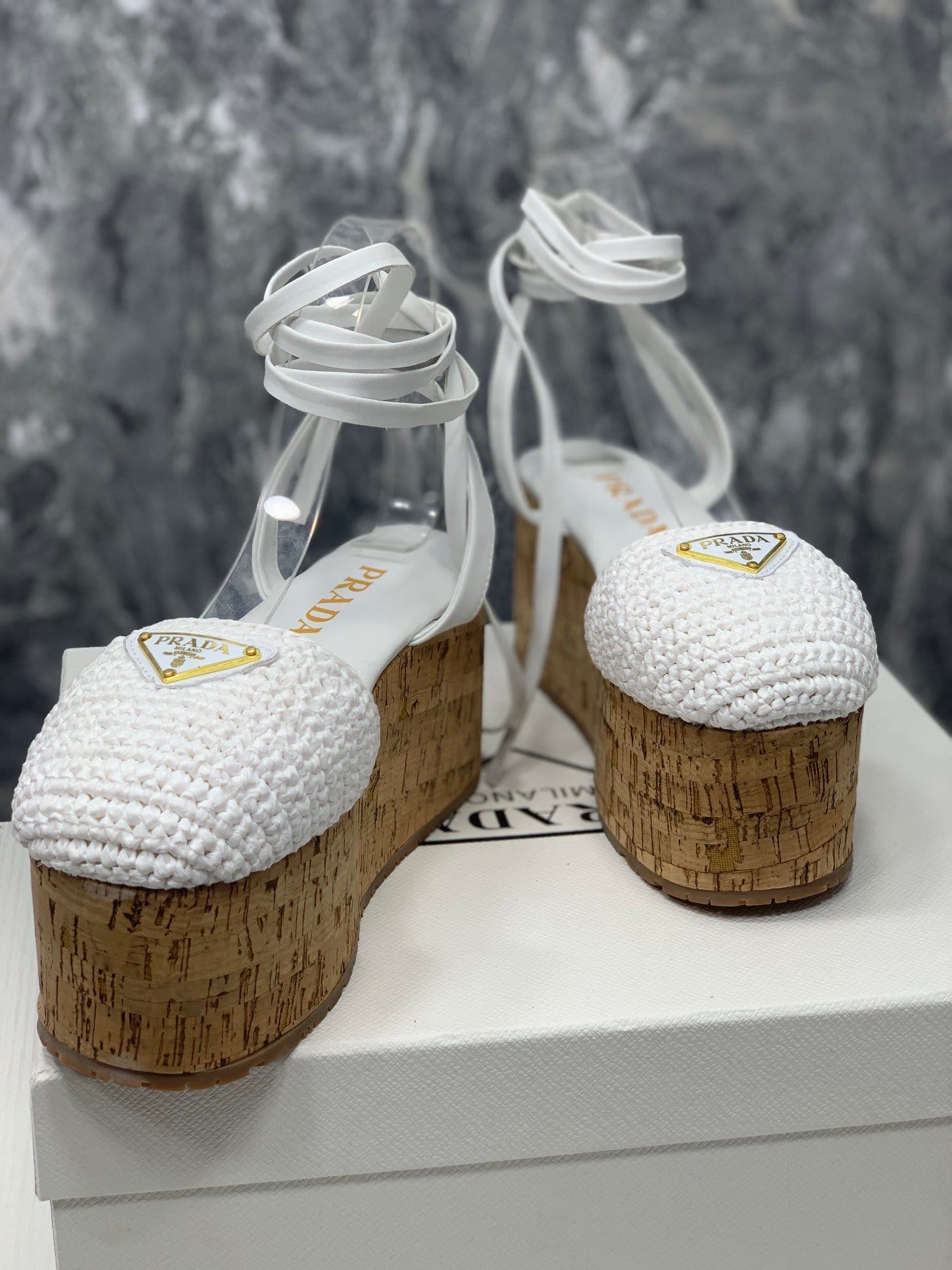 简单而精致的钩针编织图案增强了这些凉鞋的设计,配有软木坡跟和踝带。 Prada 三角形徽标为鞋子增添了标志性元素。
