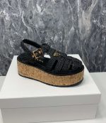 简单而精致的钩针图案增强了这款凉鞋的设计,配有软木坡跟和踝带。 Prada 三角形徽标为鞋子增添了标志性气息。