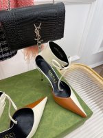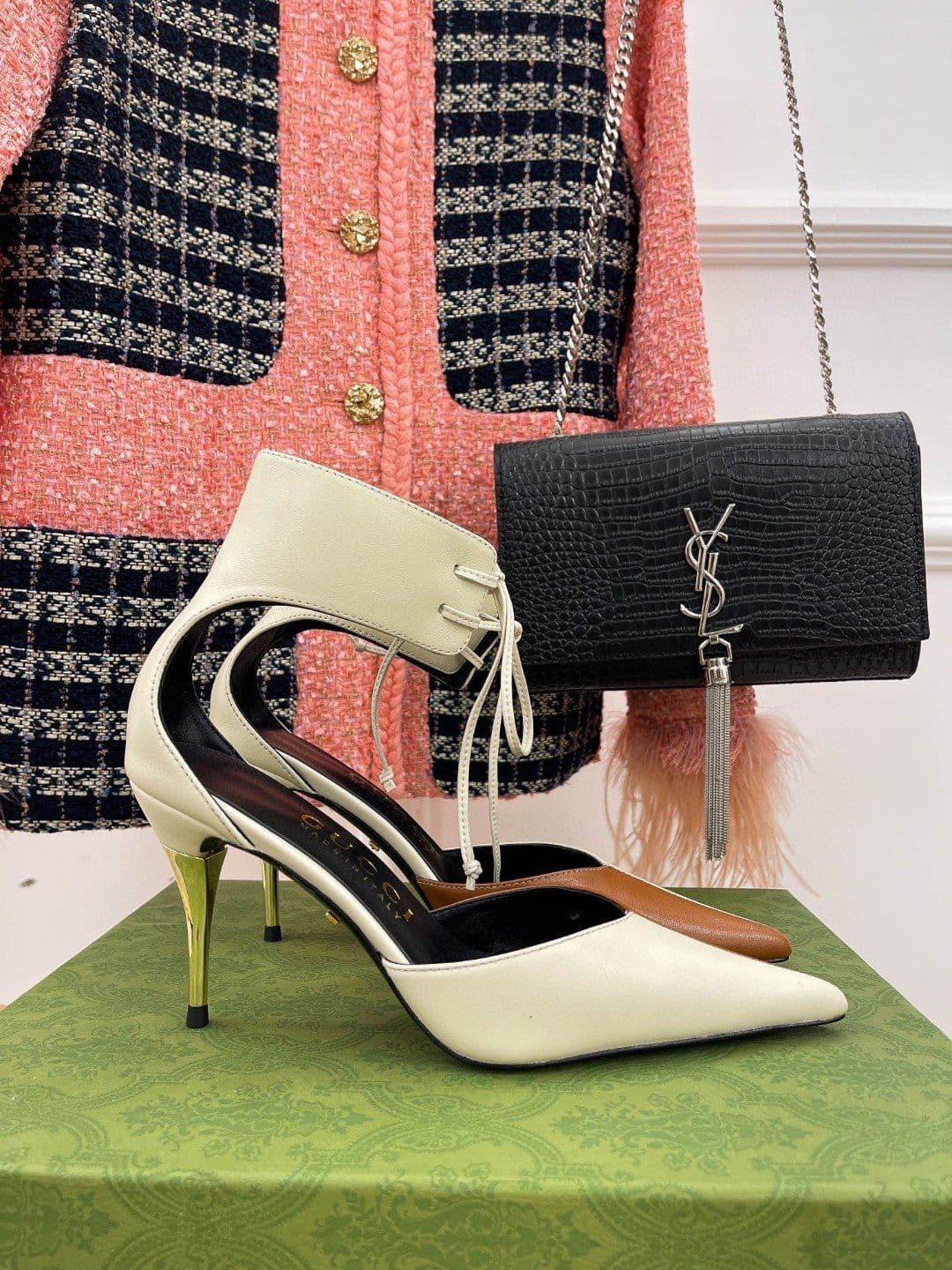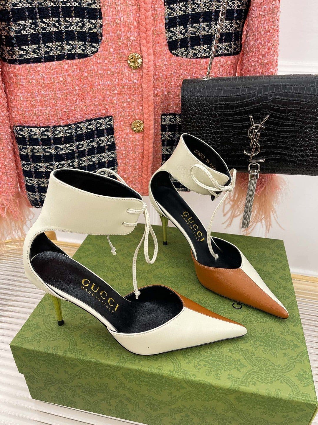 Gucci 高跟鞋带踝口白色和棕色 – 715146 BKO60 9057