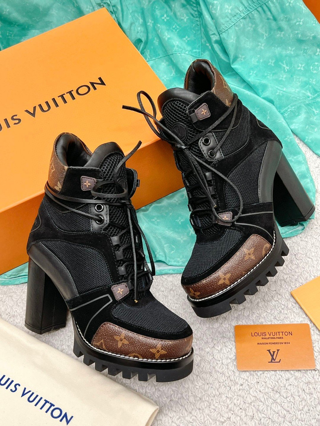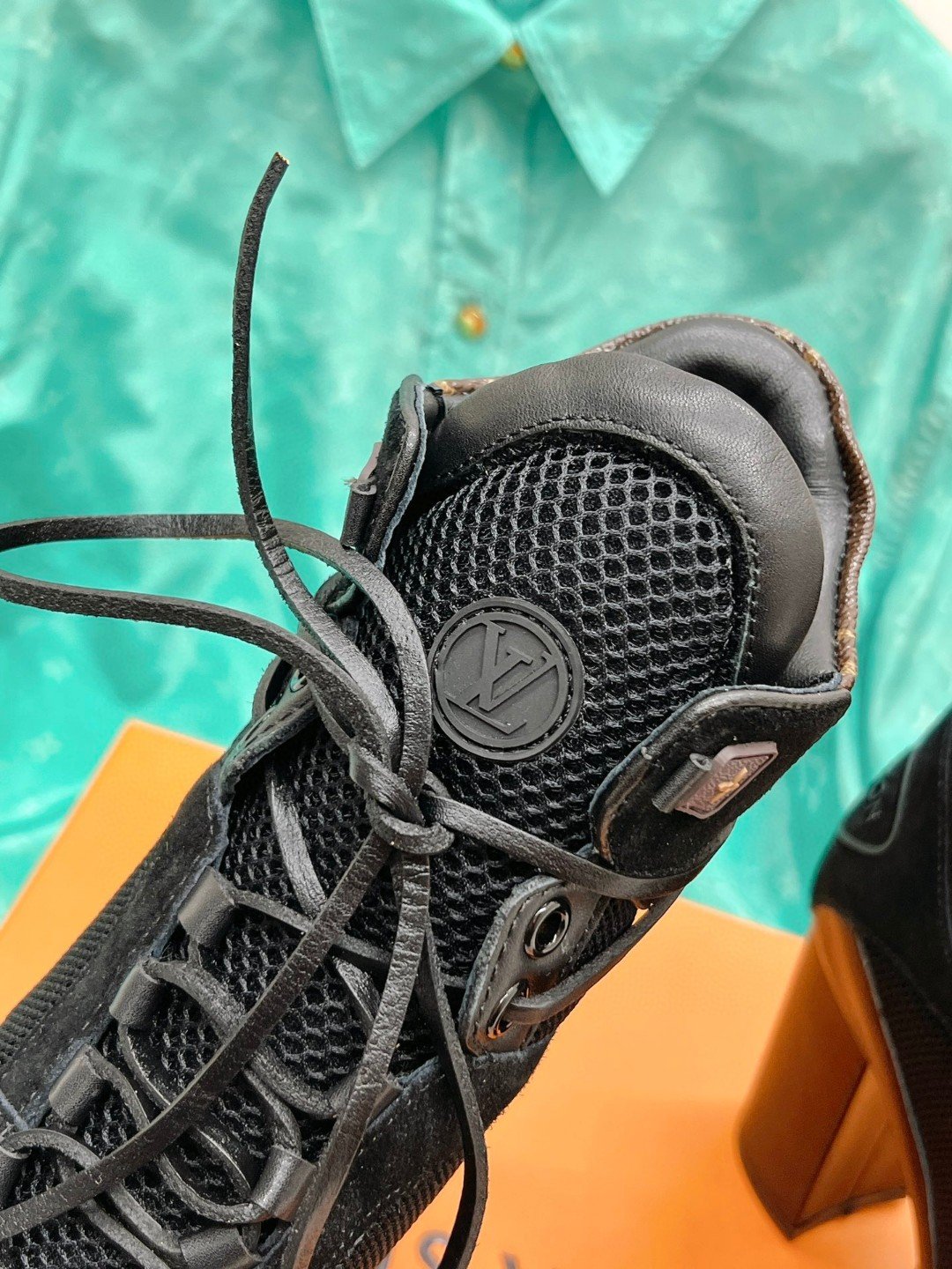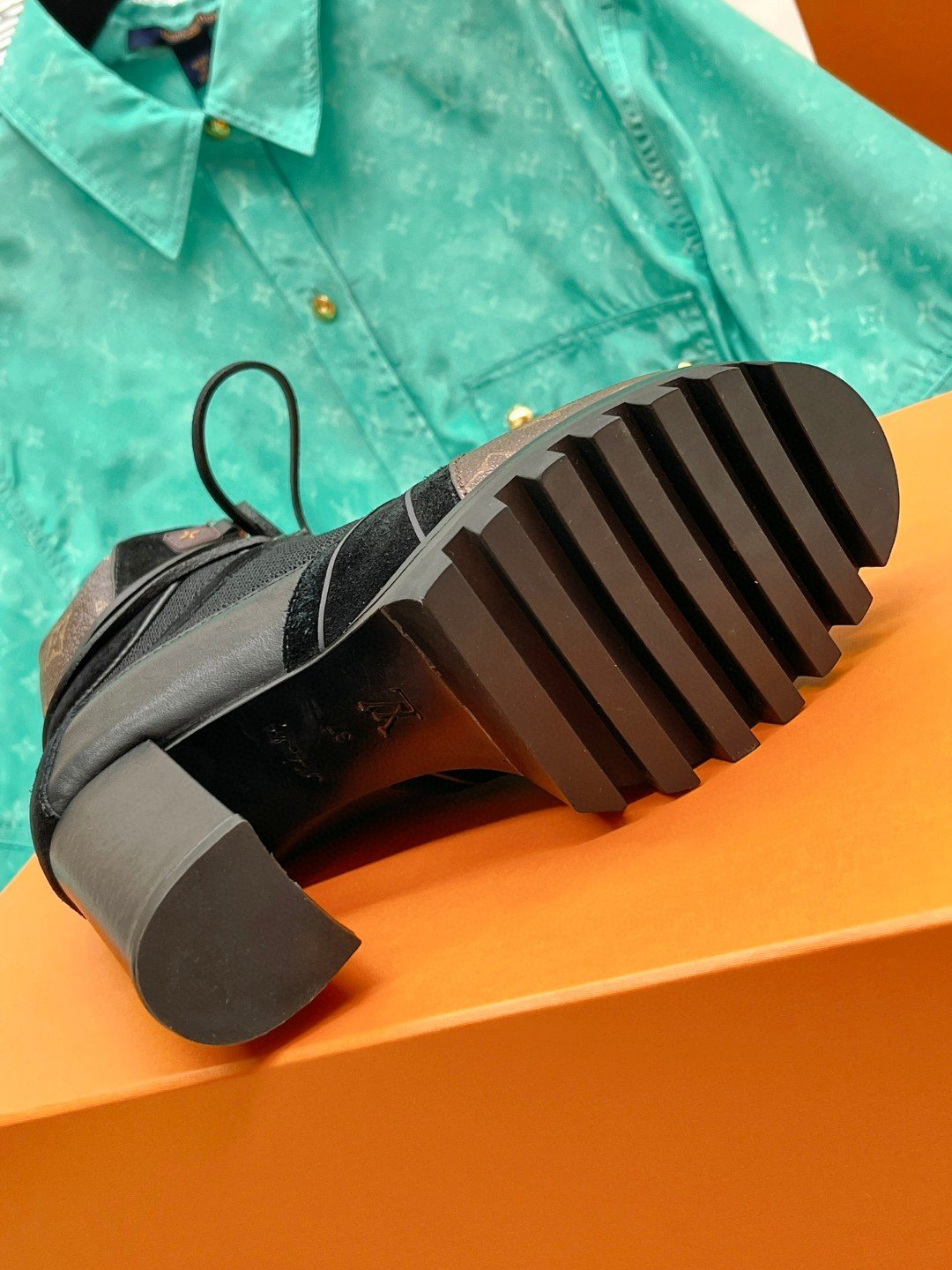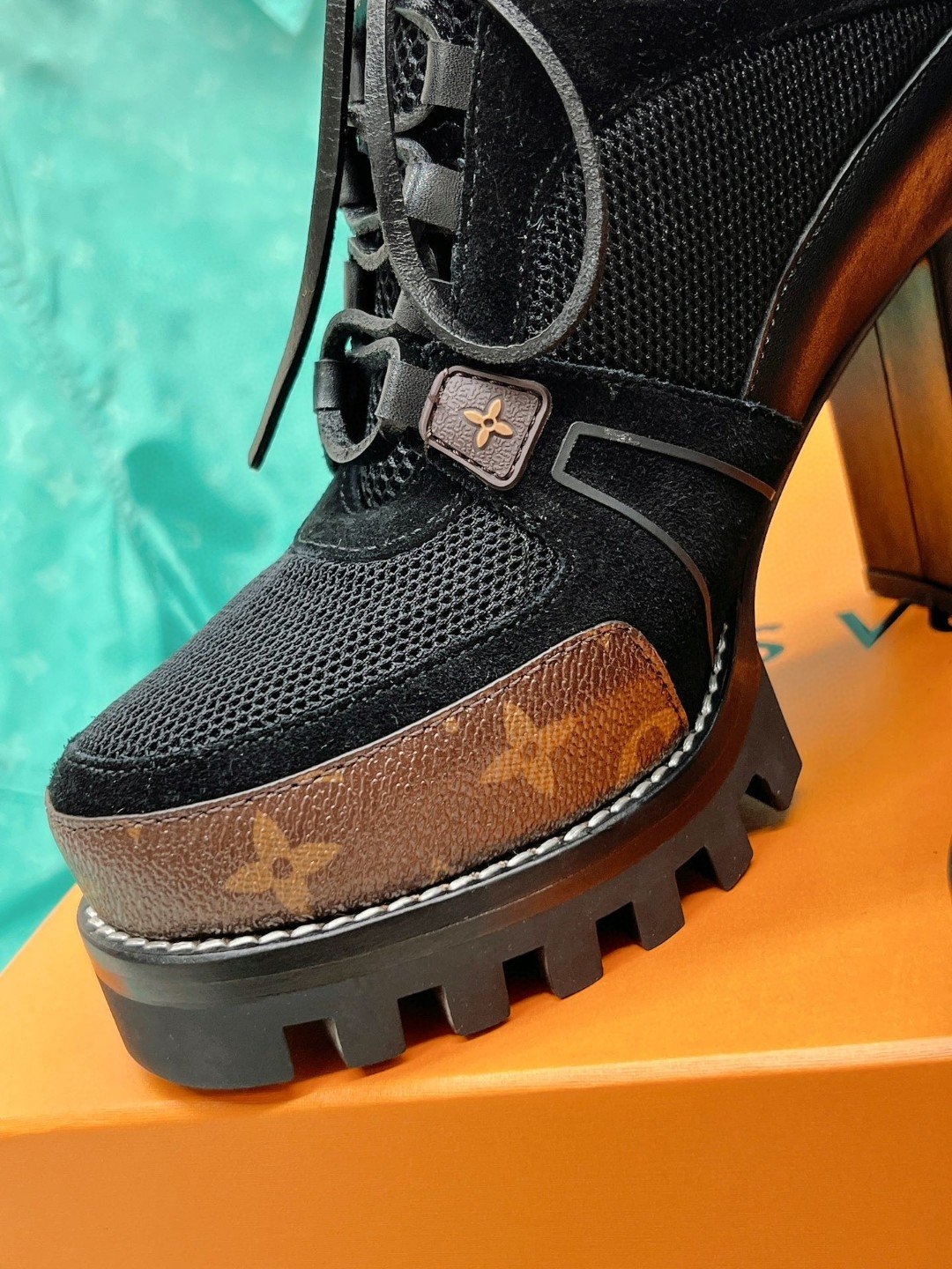 作为路易威登的标志性款式之一,星轨踝靴采用绒面小牛皮和漆皮交织帆布重新设计。该设计融入了受运动鞋启发的元素,特别是鞋面的技术网布以及带衬垫的鞋舌和鞋领。这种大胆风格的特点是高跟和纹理橡胶外底。