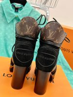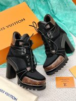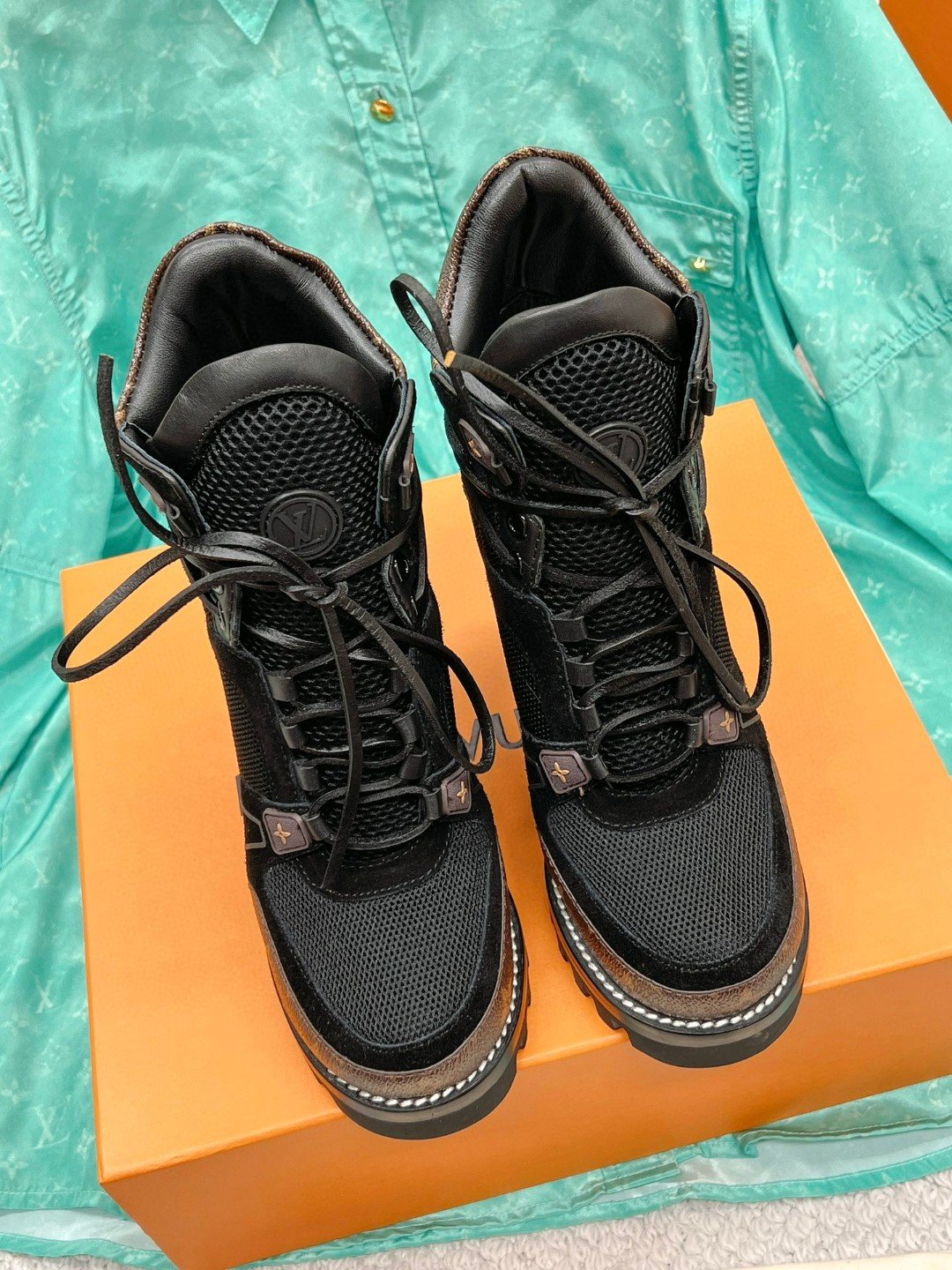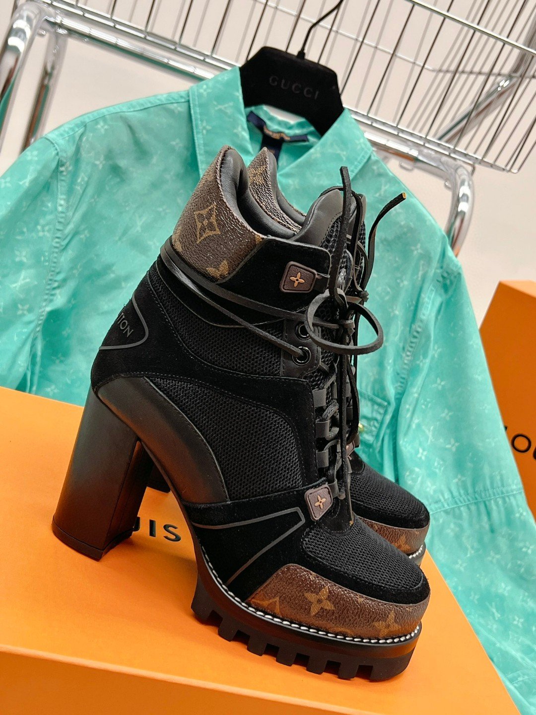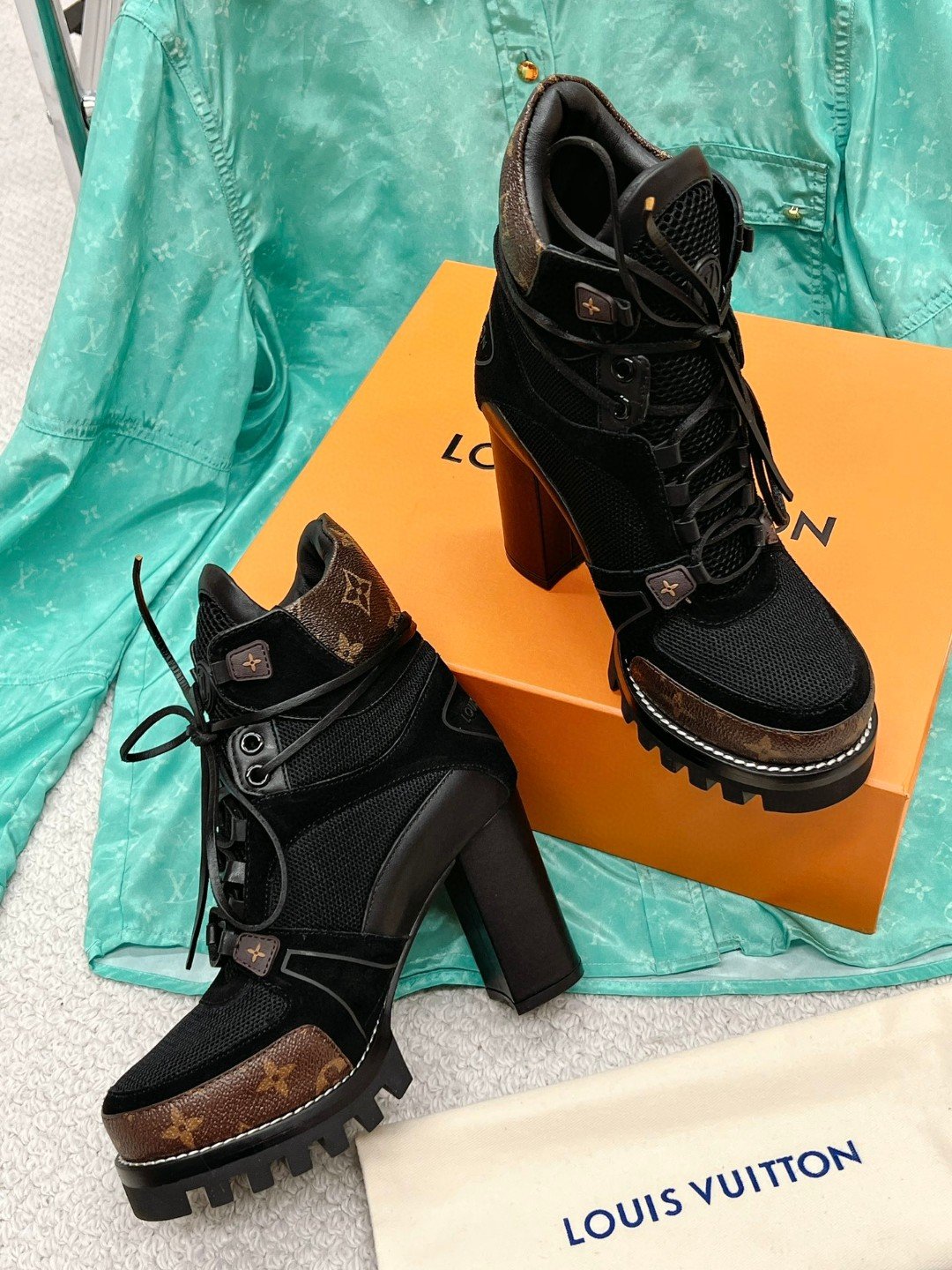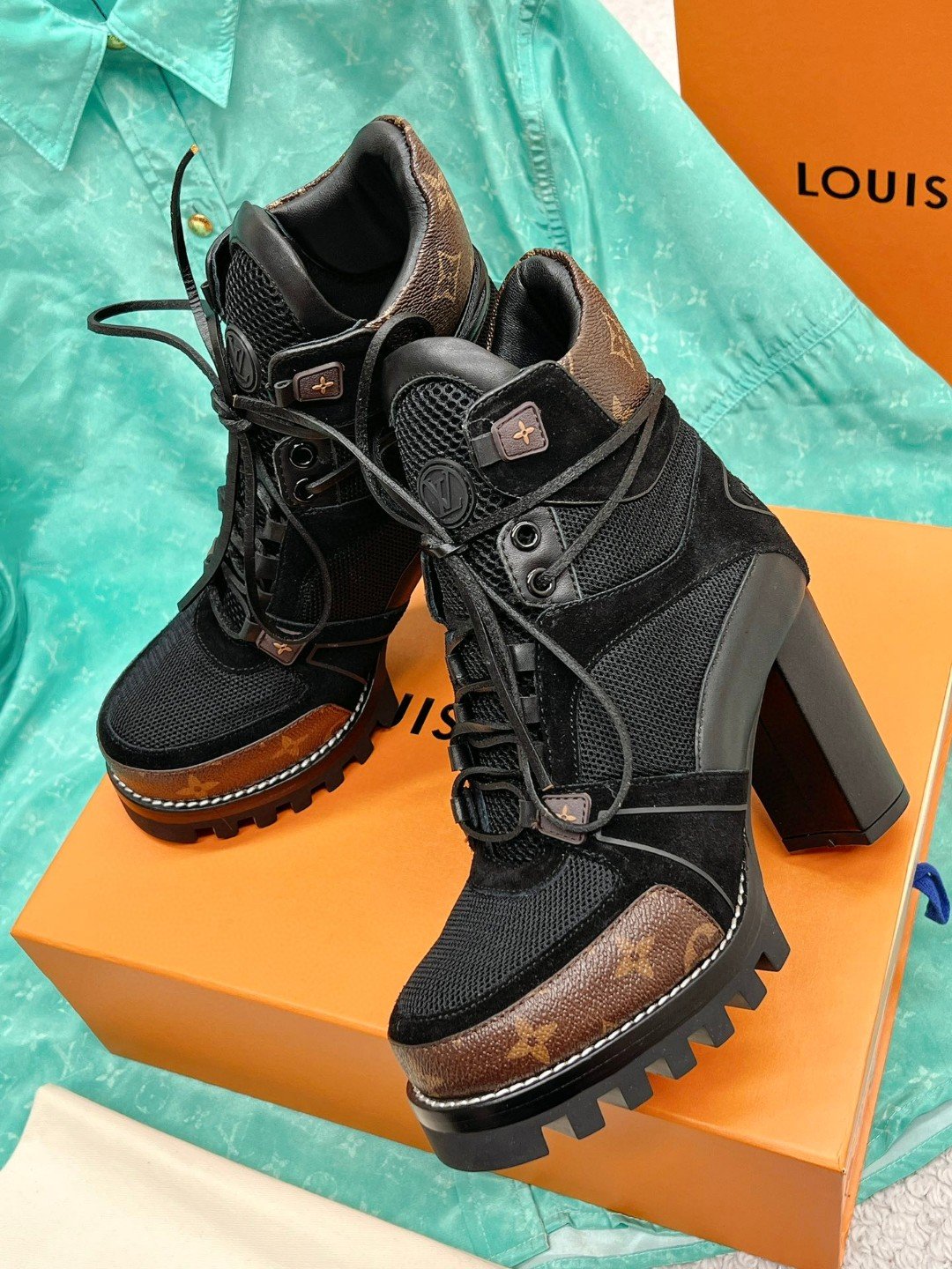 作为路易威登的标志性款式之一,星轨踝靴采用绒面小牛皮和漆皮交织帆布重新设计。该设计融入了受运动鞋启发的元素,特别是鞋面的技术网布以及带衬垫的鞋舌和鞋领。这种大胆风格的特点是高跟和纹理橡胶外底。
