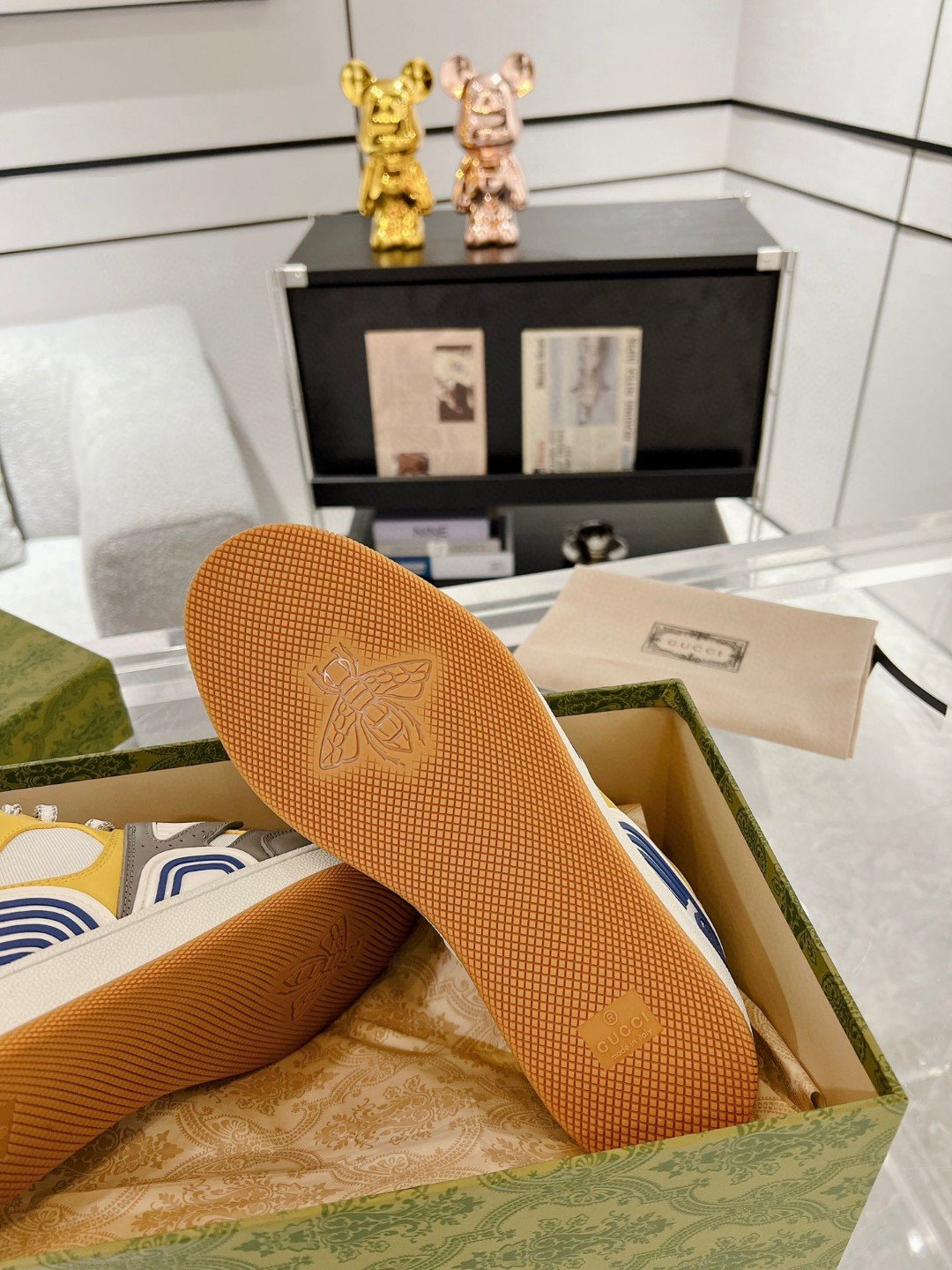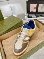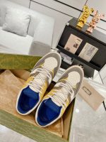 该品牌采用 90 年代篮球运动鞋的代名词,推出了对 Gucci Basket 运动鞋的全新诠释。这种风格模仿了球场审美的自我表达,具有独特的特征和细节。多色定义了这一标志性设计的新迭代。