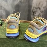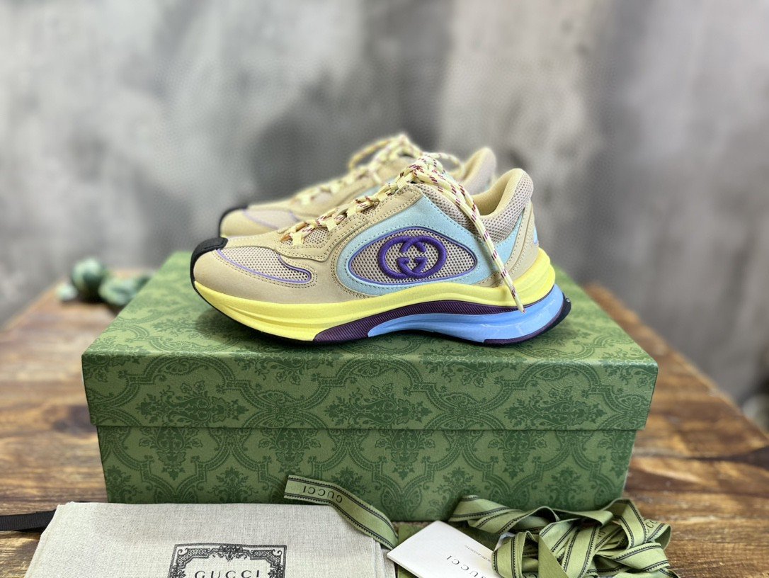 受体育界启发的设计通过 Gucci 镜片与引人注目的标志细节进行诠释。这双流线型运动鞋采用白色绒面革制成,配有双色橡胶鞋底和 Interlocking G 细节。