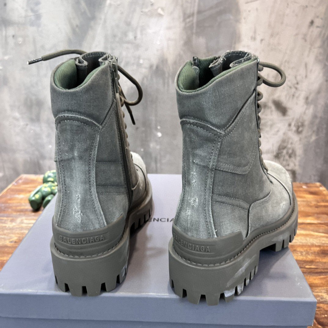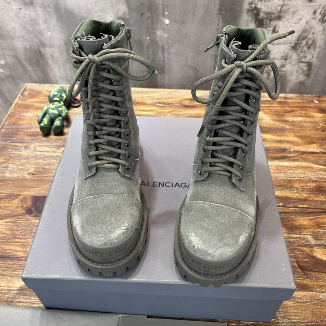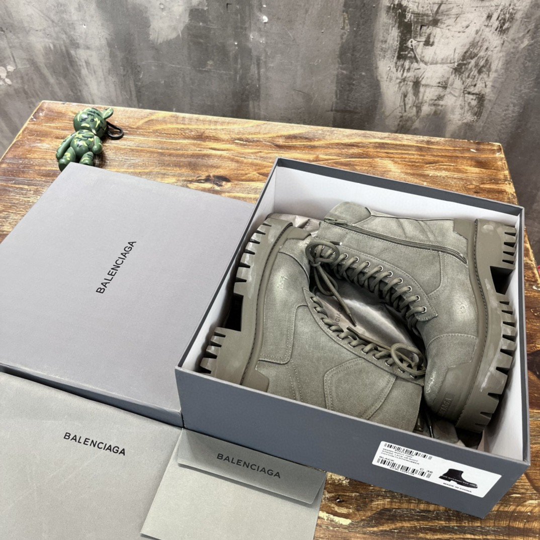 BALENCIAGA 做旧效果军靴,甘草色,仿旧饰面,后部压花徽标,圆头,长及脚踝,前系带向上开合,侧面拉链开合,粗橡胶凸纹鞋底。