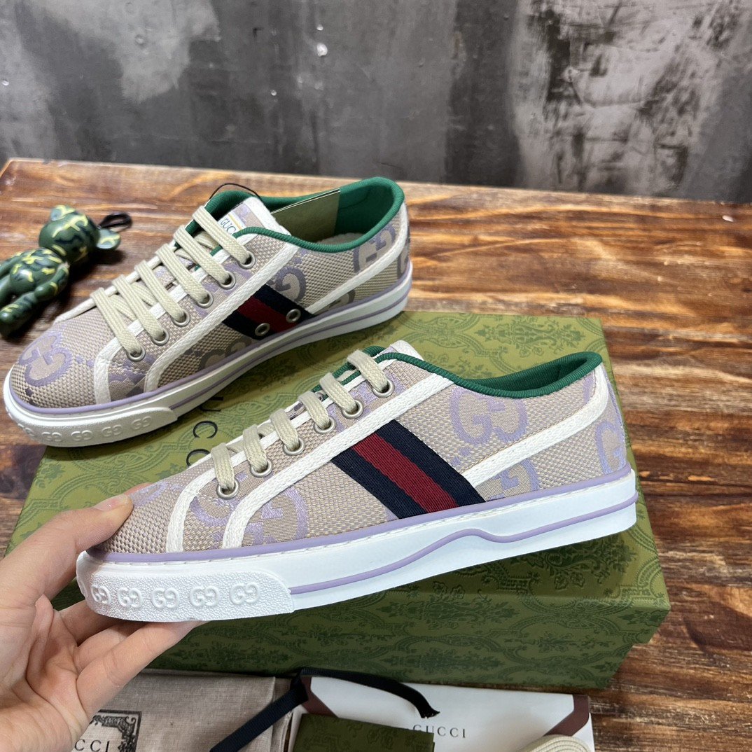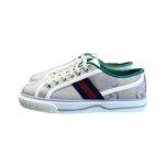 灰白色棉质低帮运动鞋。该款式融合了品牌传统的不同元素,例如 Gucci Tennis 1977 标签、鞋底纹理 GG 图案以及品牌织带细节,让人回想起品牌与运动和休闲世界的联系。