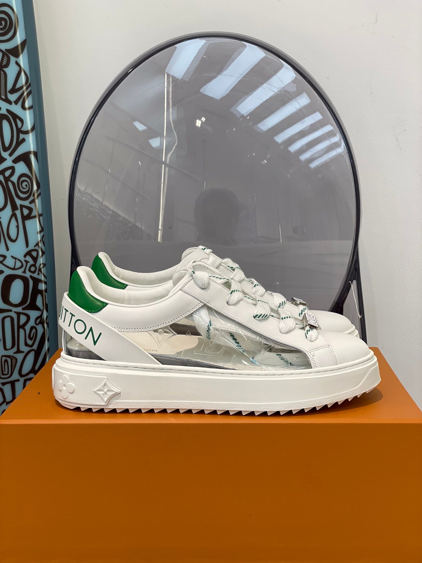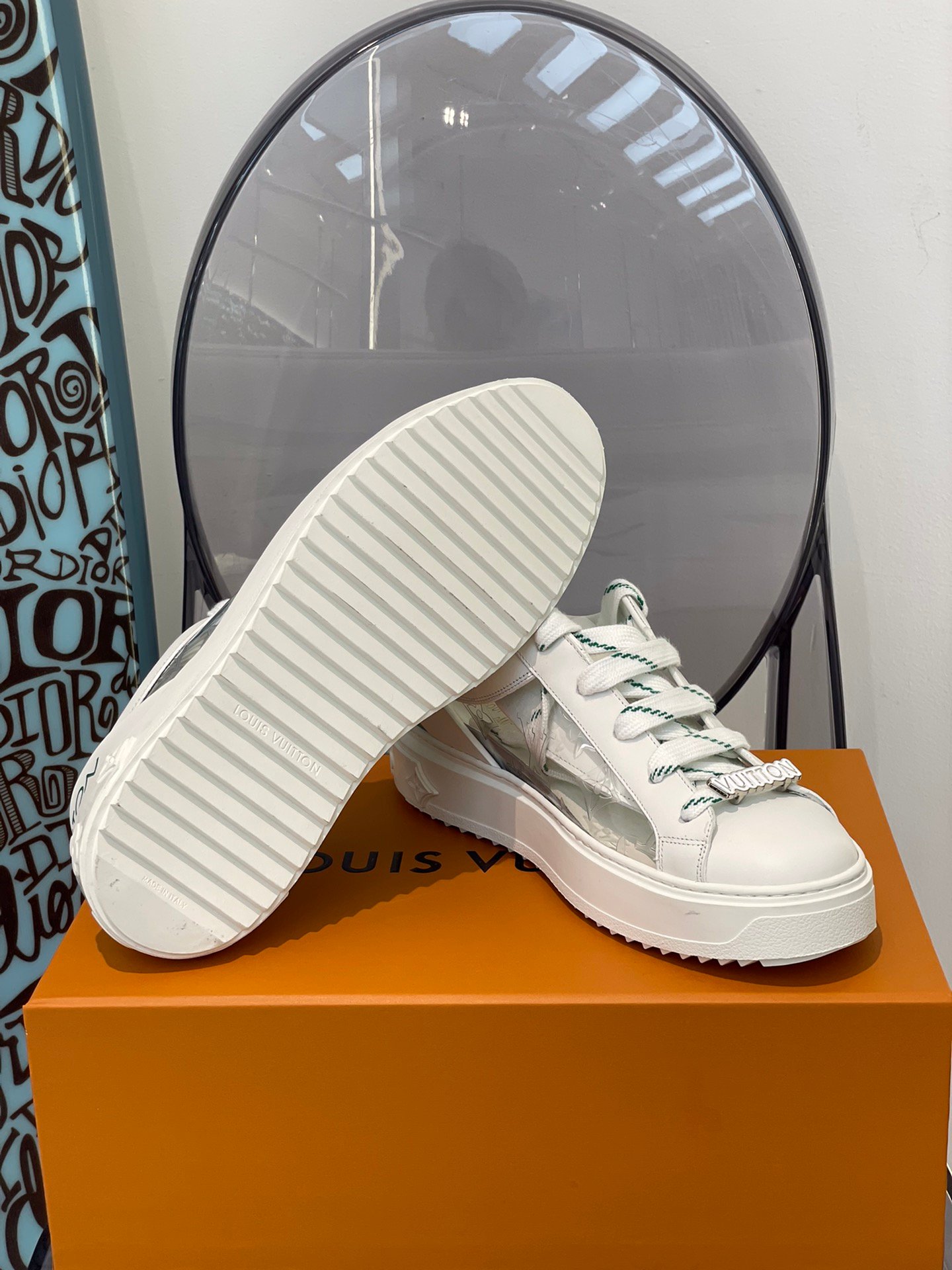 此版本的 Time Out 运动鞋采用光滑饰边制成。鞋面饰有彩色路易威登标志。它们为这款标志性设计带来珍贵、俏皮的感觉,并因其时尚的加高外底而闻名。