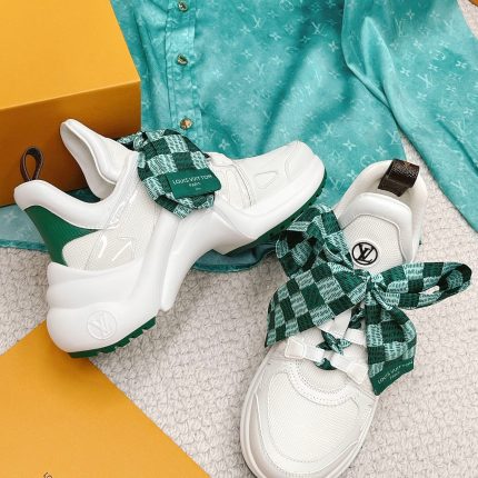 LV Archlight 运动鞋采用多种材质重新诠释,丝带鞋带印有绿色 Damier 图案。这款运动鞋标志性的波浪形外底也采用了绿色,巧妙地增加了额外的高度。该款式采用 Monogram 帆布后环设计。