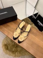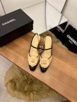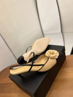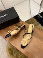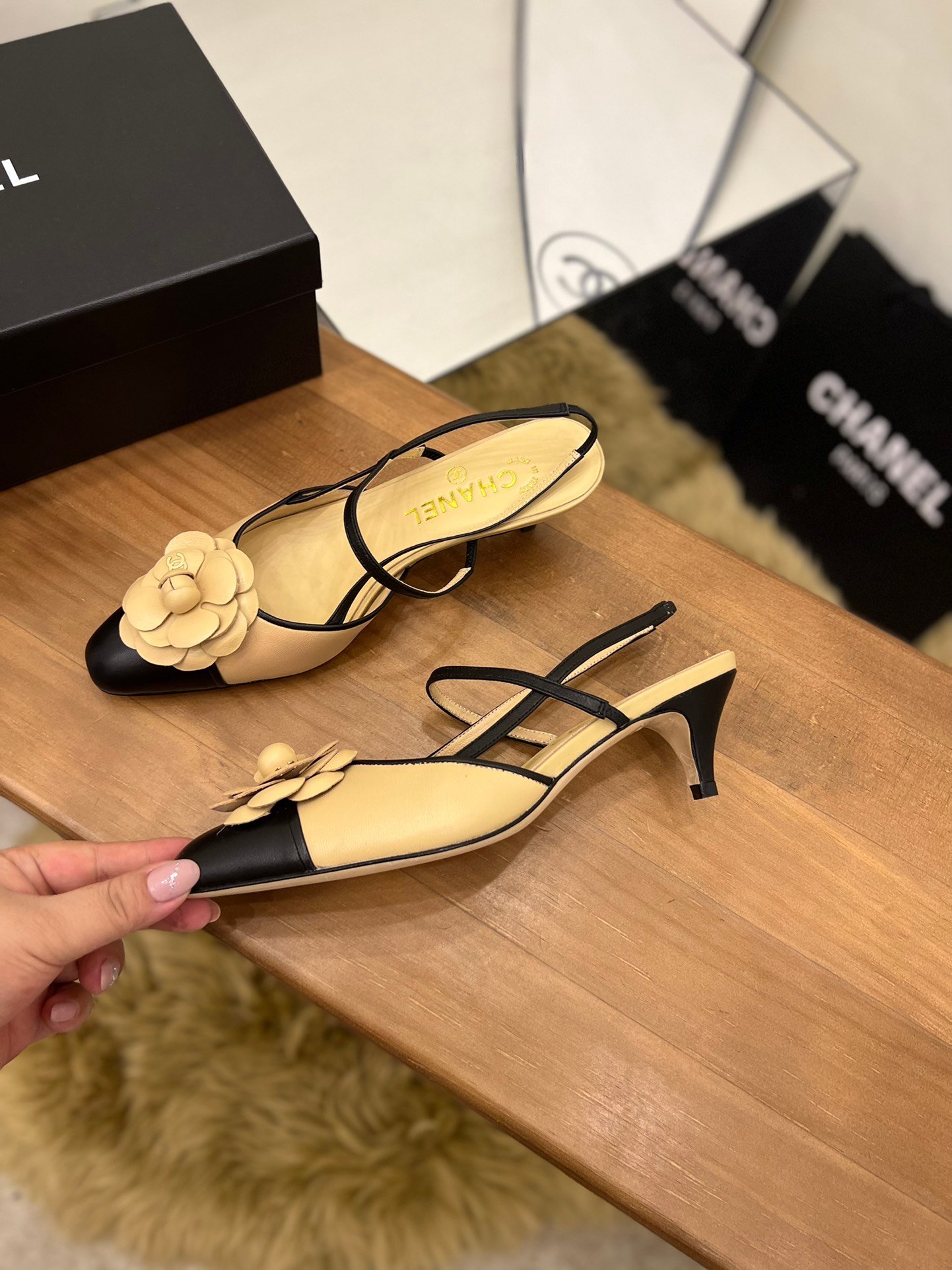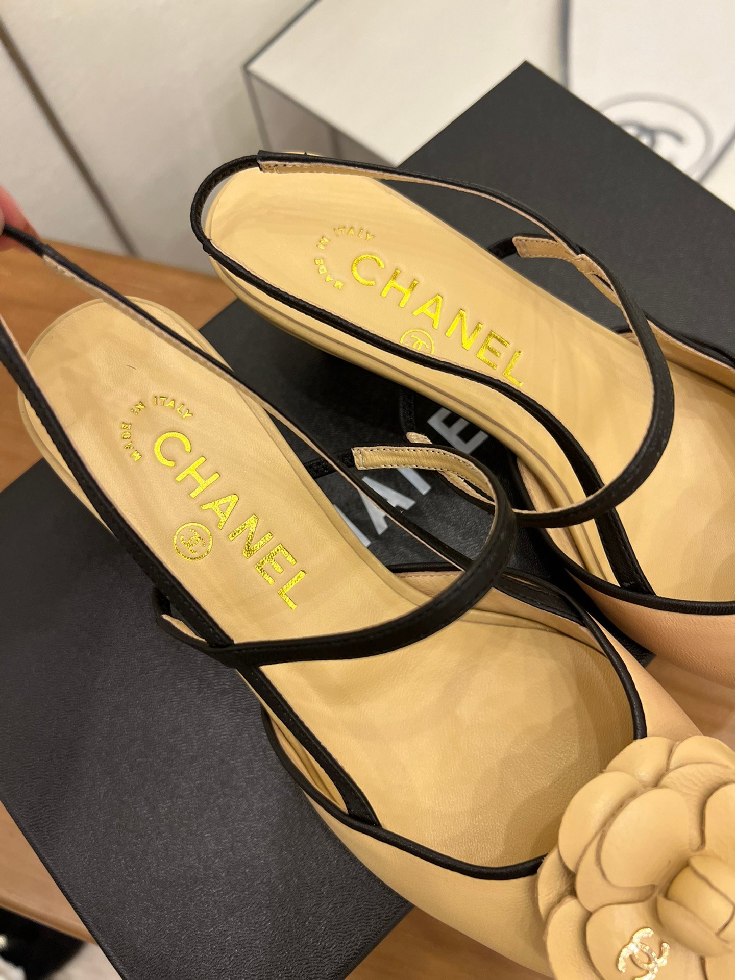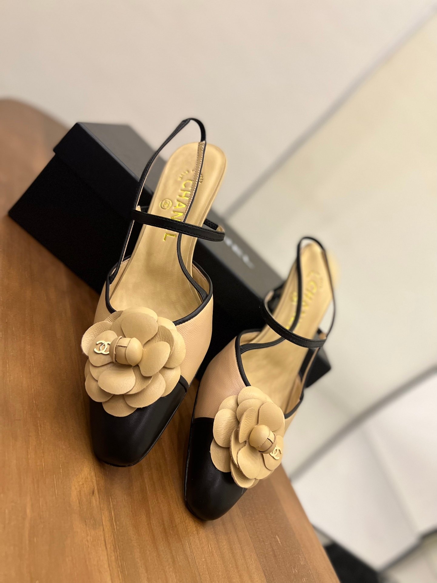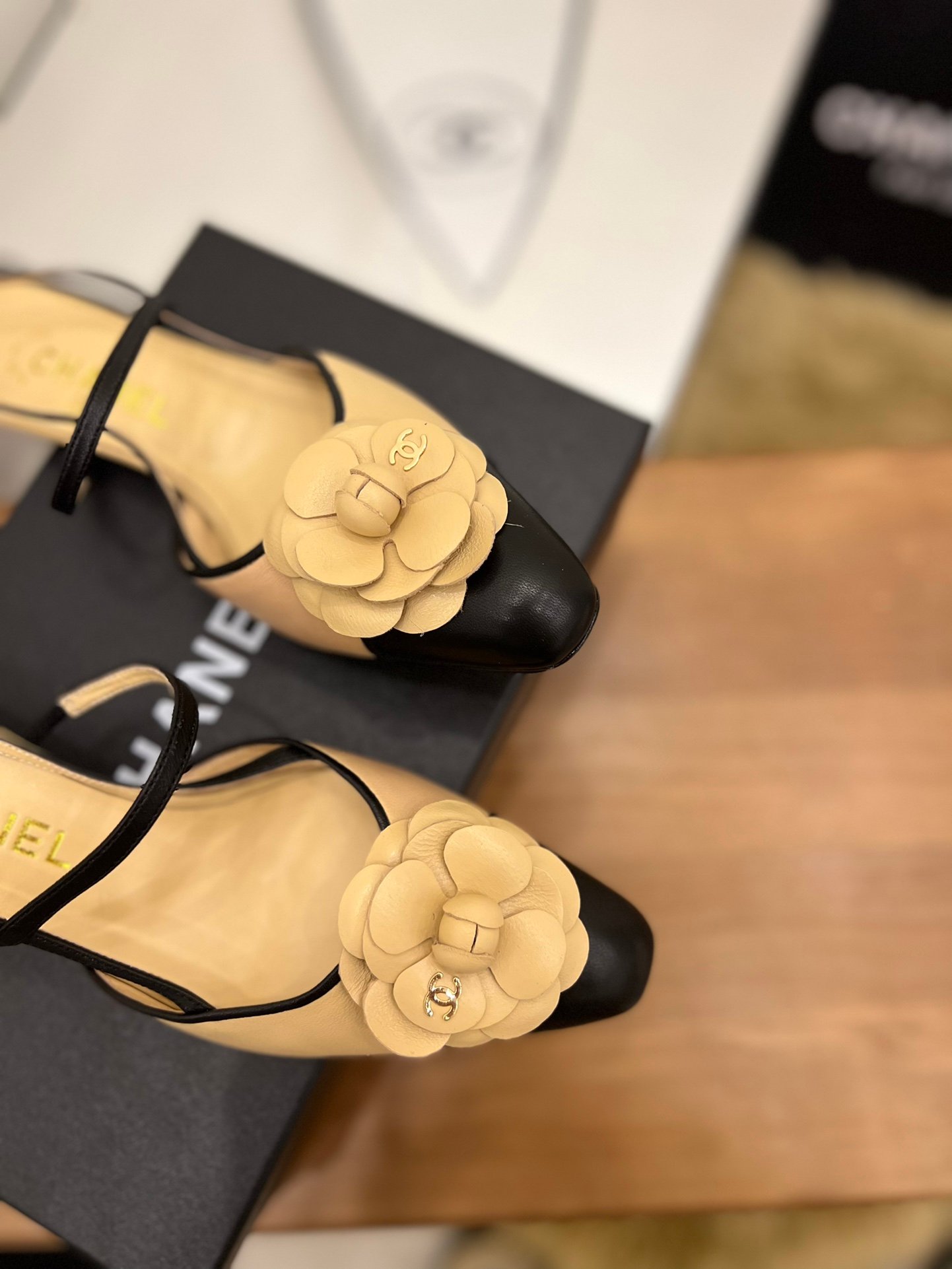 这双华丽的香奈儿高跟鞋采用包头和细露跟带子,带子横跨脚前部。正面有一朵大山茶花,侧面有一朵金色小CC。具有弹性吊带和包覆鞋跟。