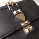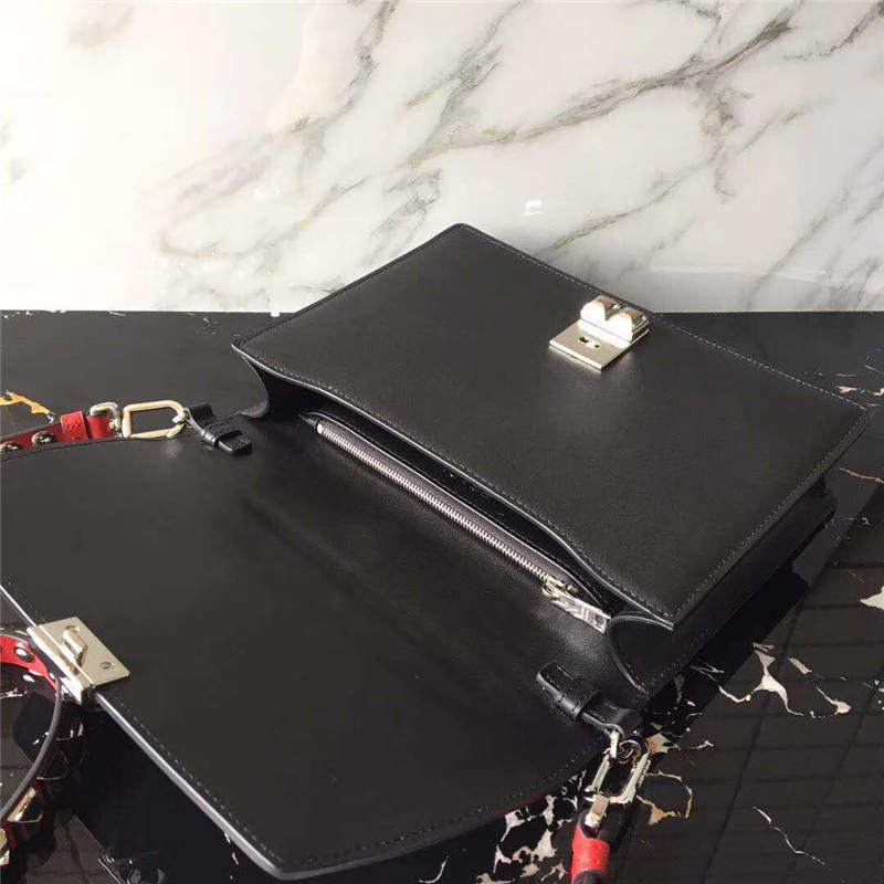 • 结构:翻盖,按锁扣合,内部拉链袋,正面卡片插槽,可拆卸式铆钉皮革肩带,正面肩带铆钉带扣