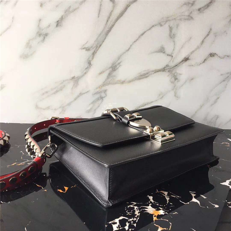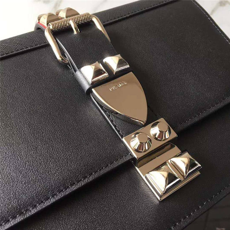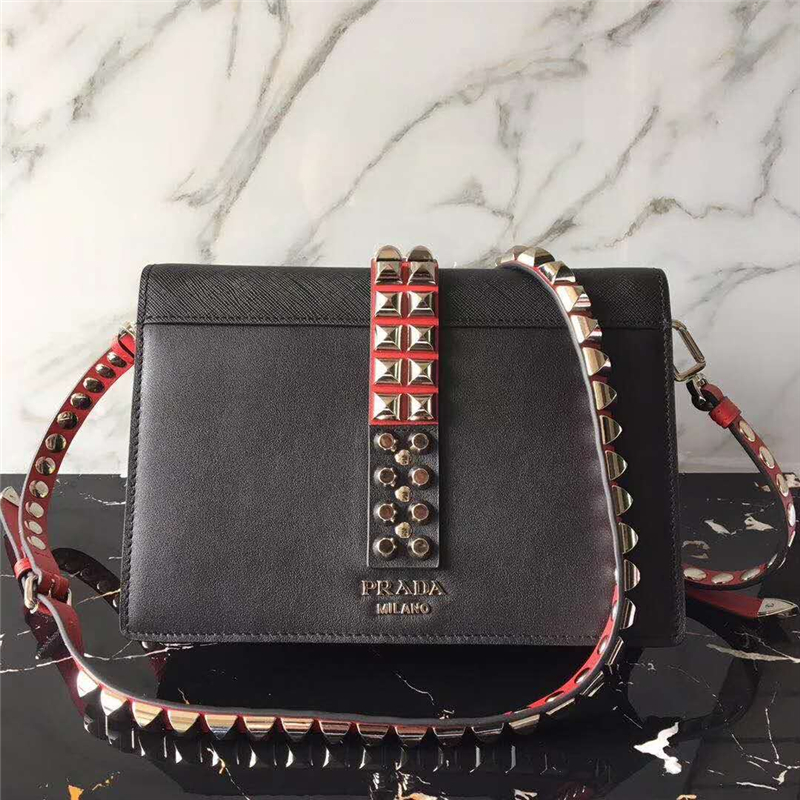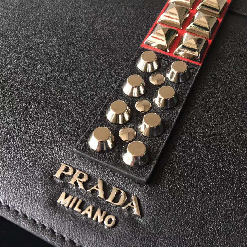 • 1BD120 Prada普拉达 2018早春最新款 铆钉装饰 小牛皮手袋 黑色