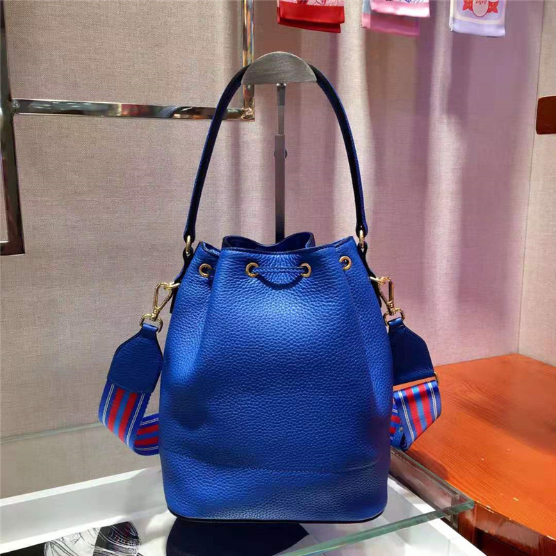 - 详细介绍:P家又来一款爆款水桶包,2019年最新/最爆的水桶包,采用进口小牛皮鹿皮纹材质,皮革提手,2条替换肩带,可拆卸可调节五彩织物肩带,配有皮革肩垫,金属刻字徽标,顶部饰有皮革抽绳 ,标志衬里,内部有一个皮革口袋,容量又大又好看的爆款