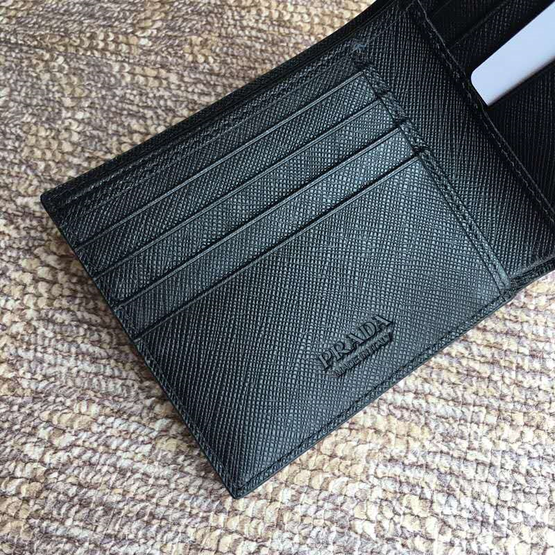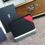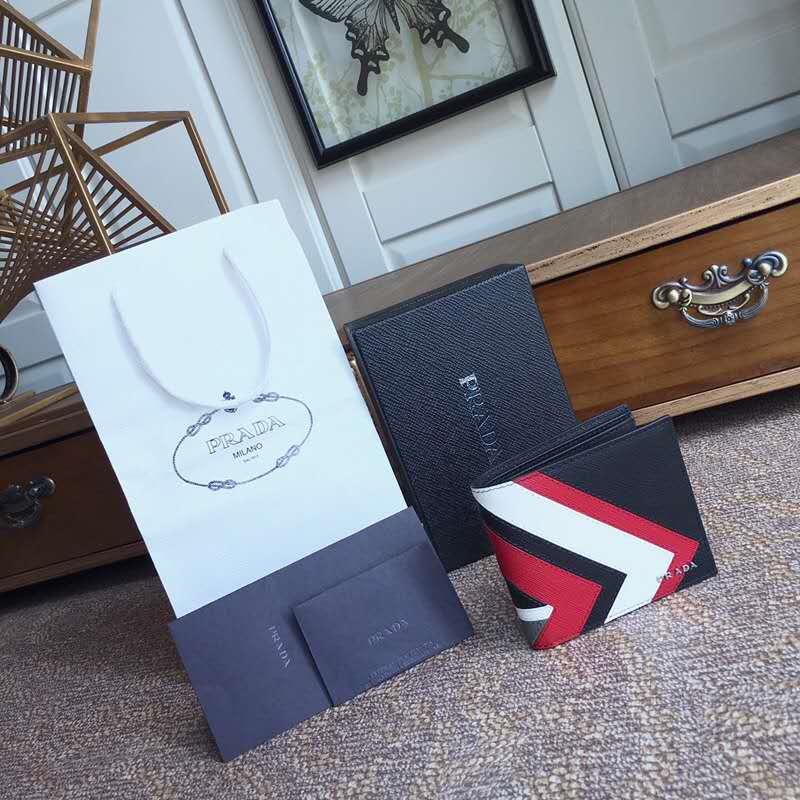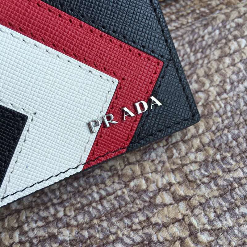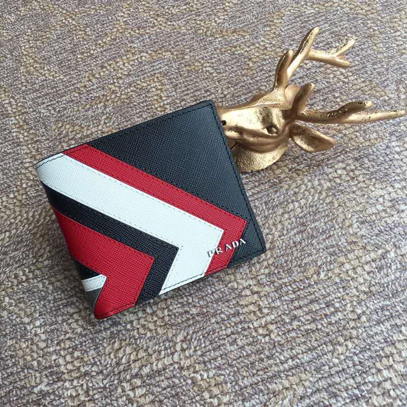 - 2MO513 Prada普拉达 Saffiano皮革 嵌花装饰 三色拼 双折短款钱夹 黑红白