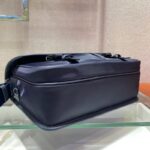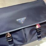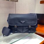 - 结构:尼龙和Saffiano皮革材质两枚金属旁开扣两个正面口袋,其中一个带拉链背面拉链袋两个内部手机袋可调式尼龙徽标提花肩带织物徽标衬里正面涂珐琅三角形金属徽标内部涂珐琅金属徽标铭牌