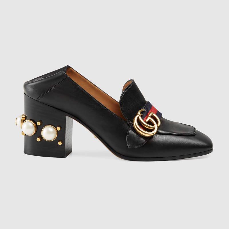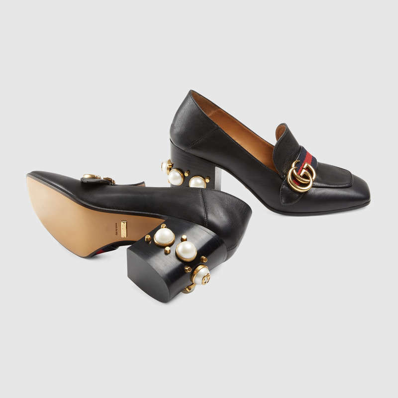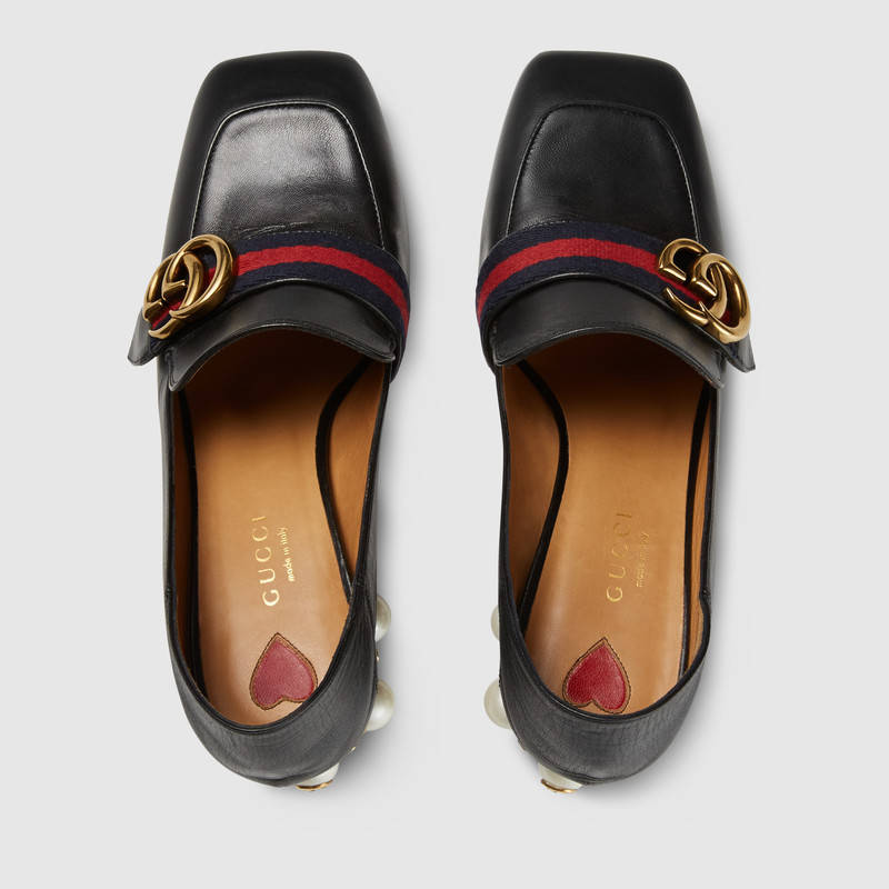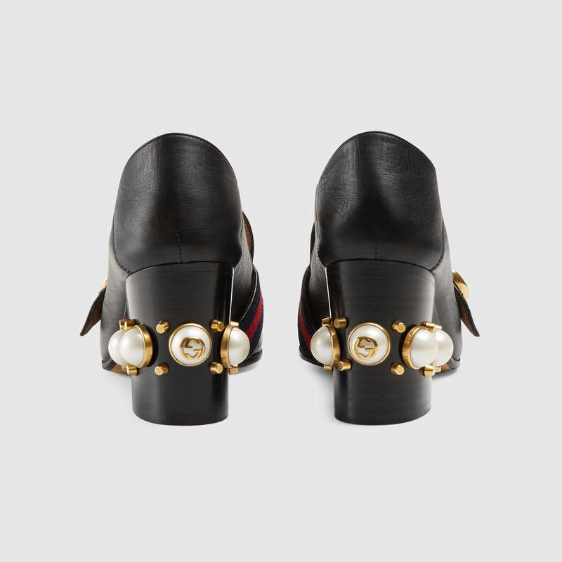 425943 GUCCI 双G装饰 皮革 GG珍珠和铆钉 中跟乐福鞋 黑色