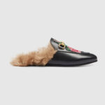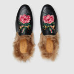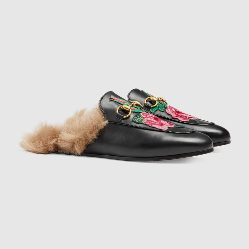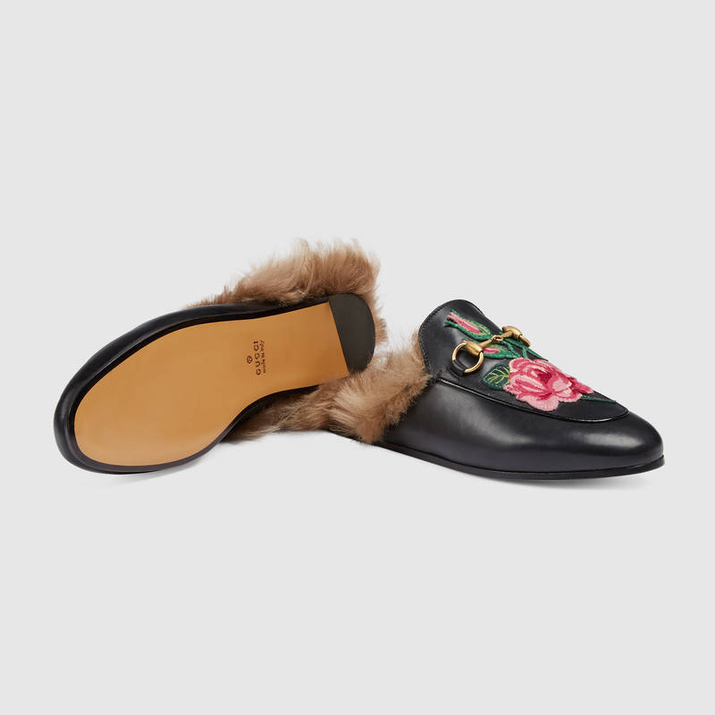 - 详细介绍:此款Princetown系列拖鞋全部加衬,配以羊毛滚边,装饰品牌标志性的马衔扣细节。两只拖鞋正面均装饰花朵贴花。