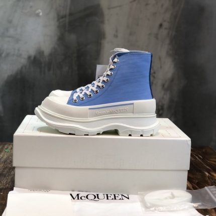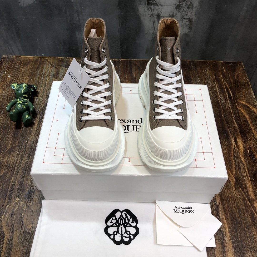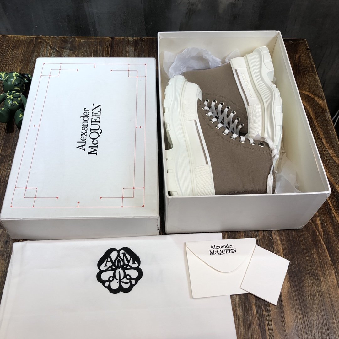 帆布系带靴,配有厚实的超大橡胶胎面鞋底。这款靴子饰有纹理橡胶包裹和同色 Alexander McQueen 标志,靴子背面饰有标志性丝带。圆头靴型轮廓细节橡胶鞋头。
