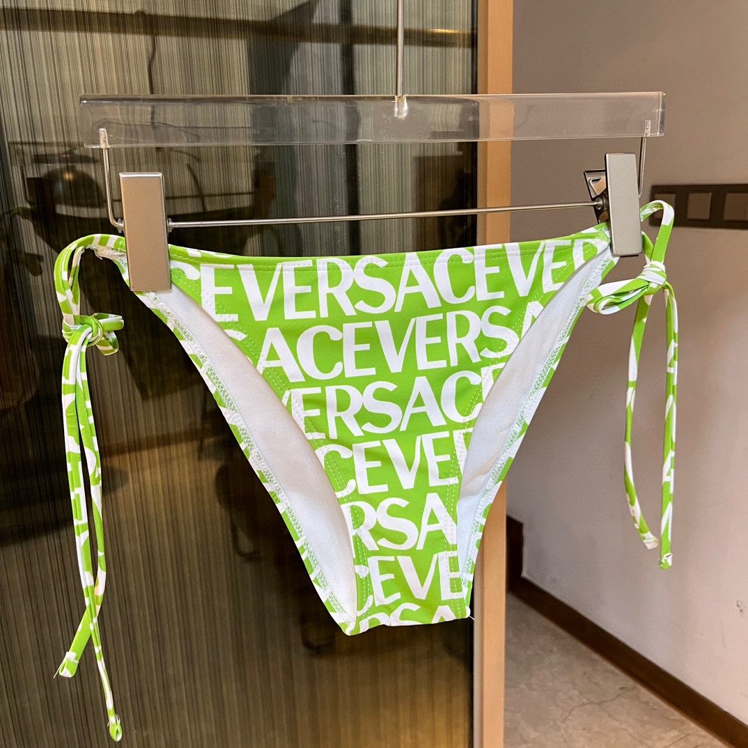 These bikini bottoms feature the Versace Allover logo with a metallic outline.