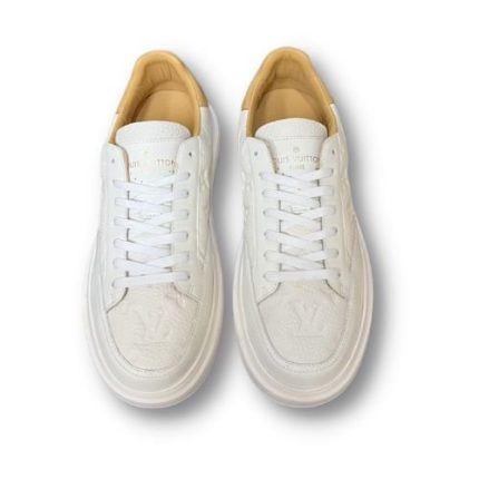 Beverly Hills 运动鞋采用柔软的粒面面料制成,压纹有标志性的 Monogram 图案。背面的自然装饰让人想起路易威登商品上的装饰。该型号的特点是超轻白色橡胶外底,压印有 House 标志。