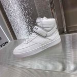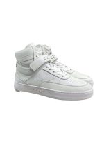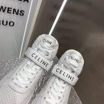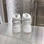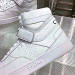 Celine Trainer 高帮运动鞋带划痕,鞋面有细孔,鞋跟有徽标压花,采用魔术贴固定。外底外侧刻有 Celine 凹纹签名。侧面饰有图形线条。白色橡胶鞋底。