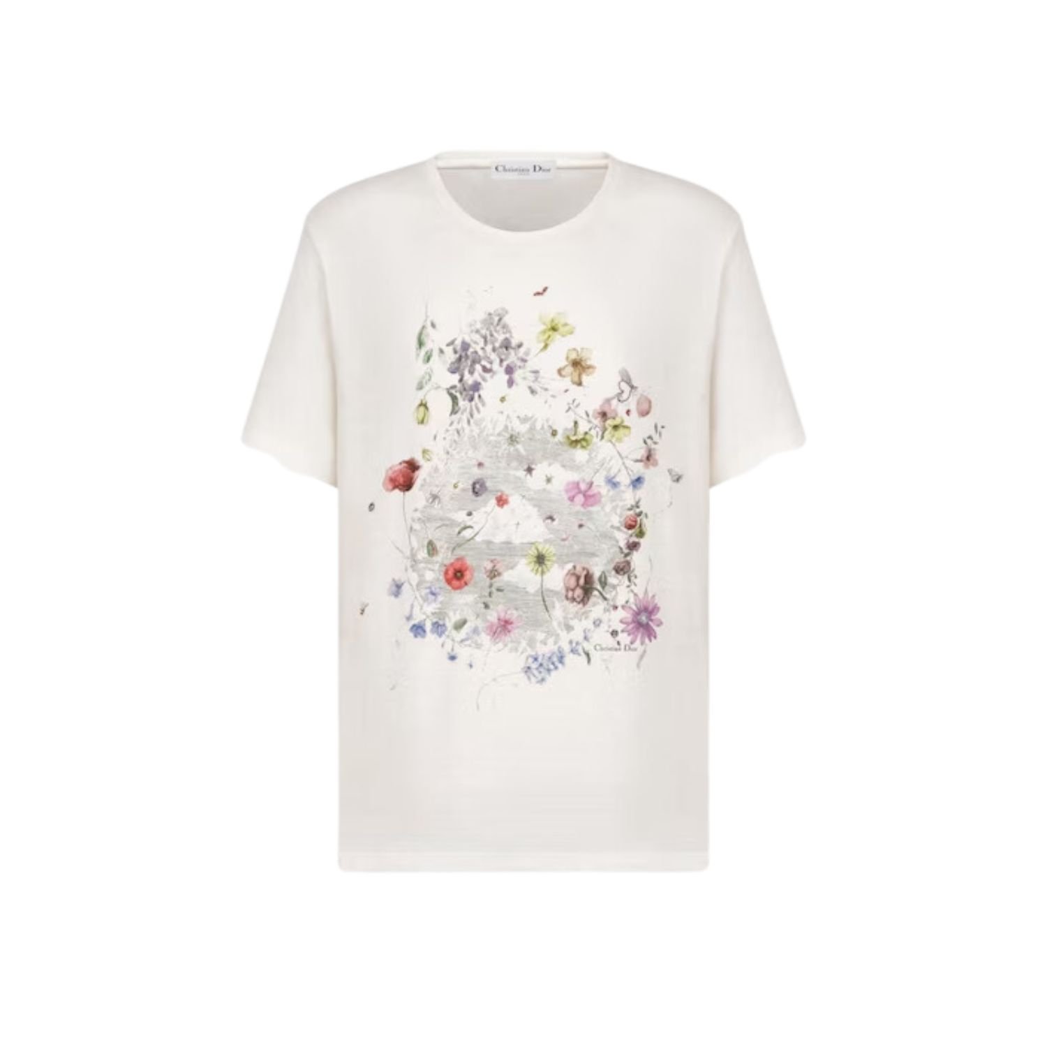 白色棉麻平纹针织 T 恤呈现红色多色 Florilegio 图案,展现田园风光、多彩优雅的花卉宇宙。标志性的蜜蜂图案以及背面的 CD 签名增强了其经典的圆领剪裁。该 T 恤可与该系列中的其他 Florilegio 作品搭配。