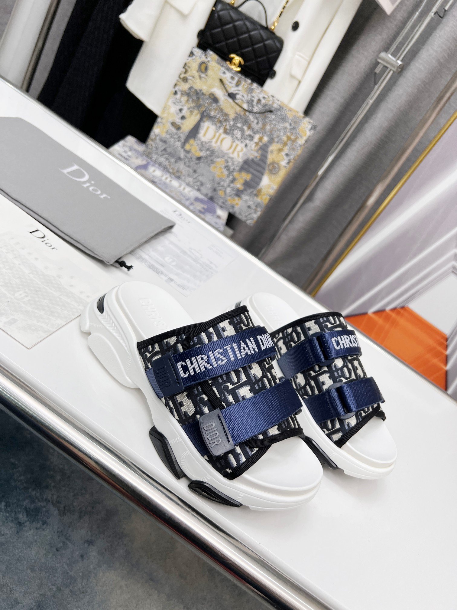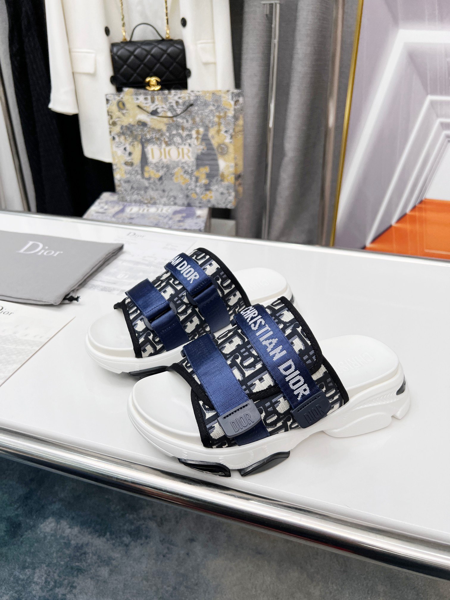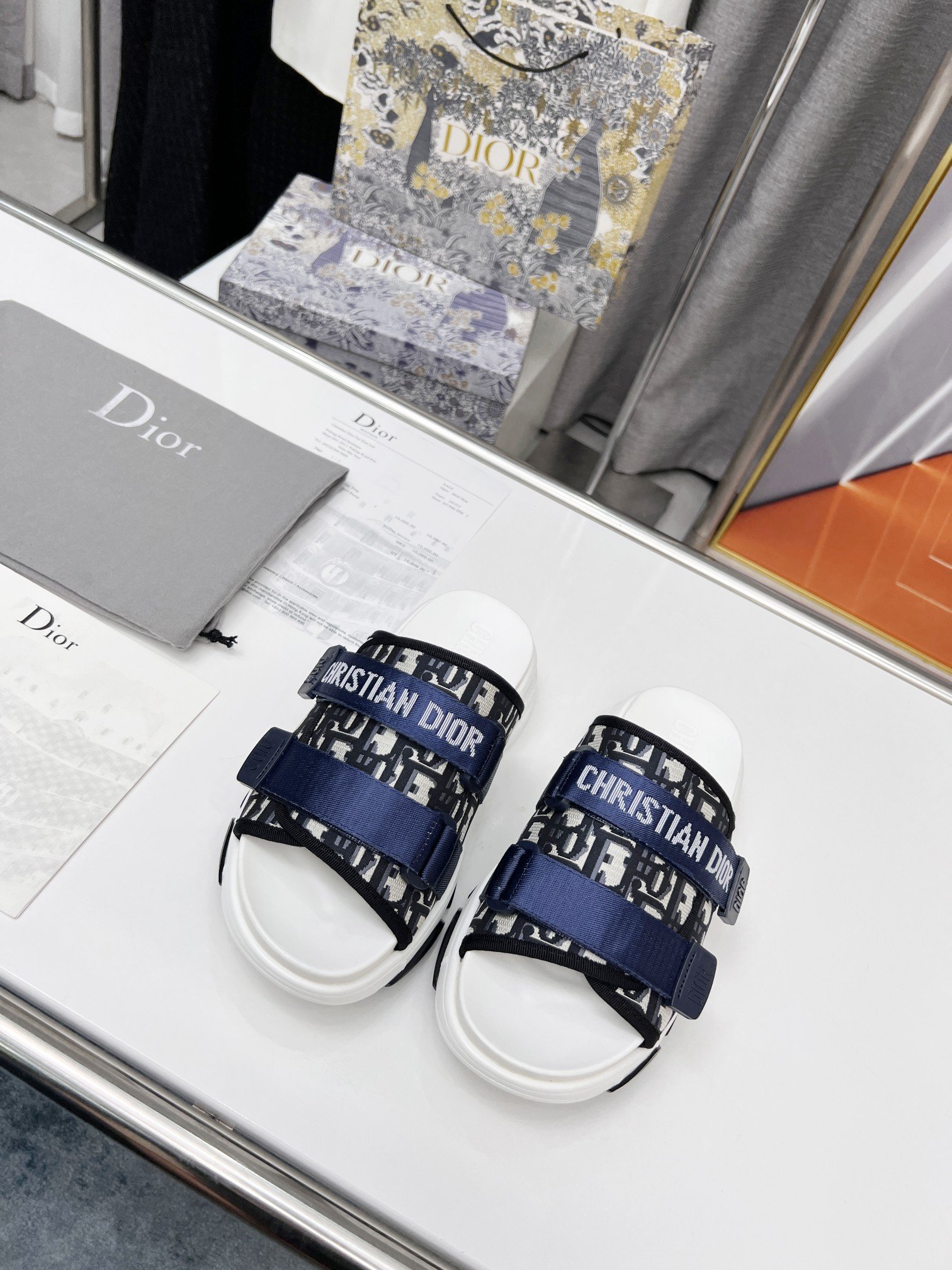 D-Wander 拖鞋是运动鞋和凉鞋的混合设计。轻盈舒适的鞋底配有防刮带,运动线条营造出轻松的感觉。鞋面的迷彩图案和每根带子上的“Christian Dior”签名使外观更加完美。