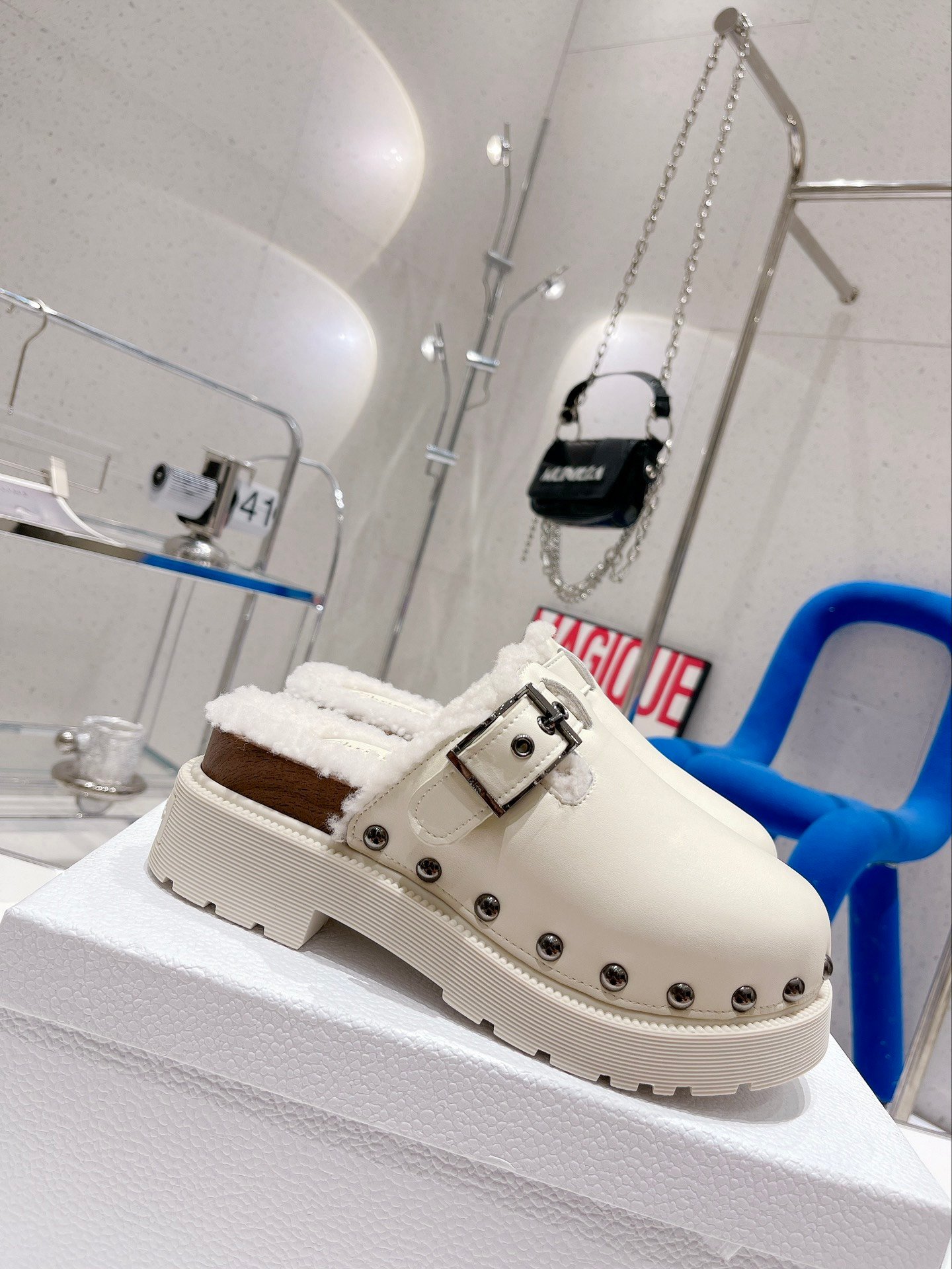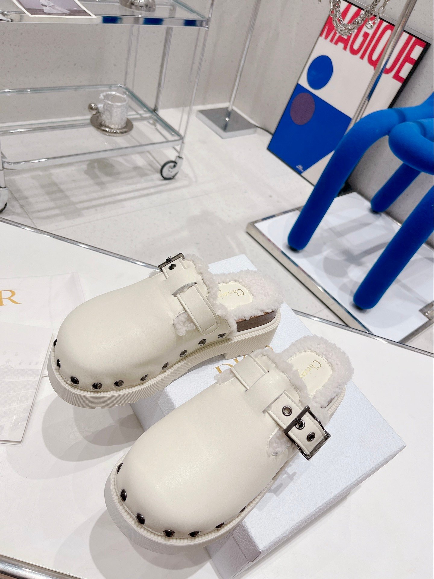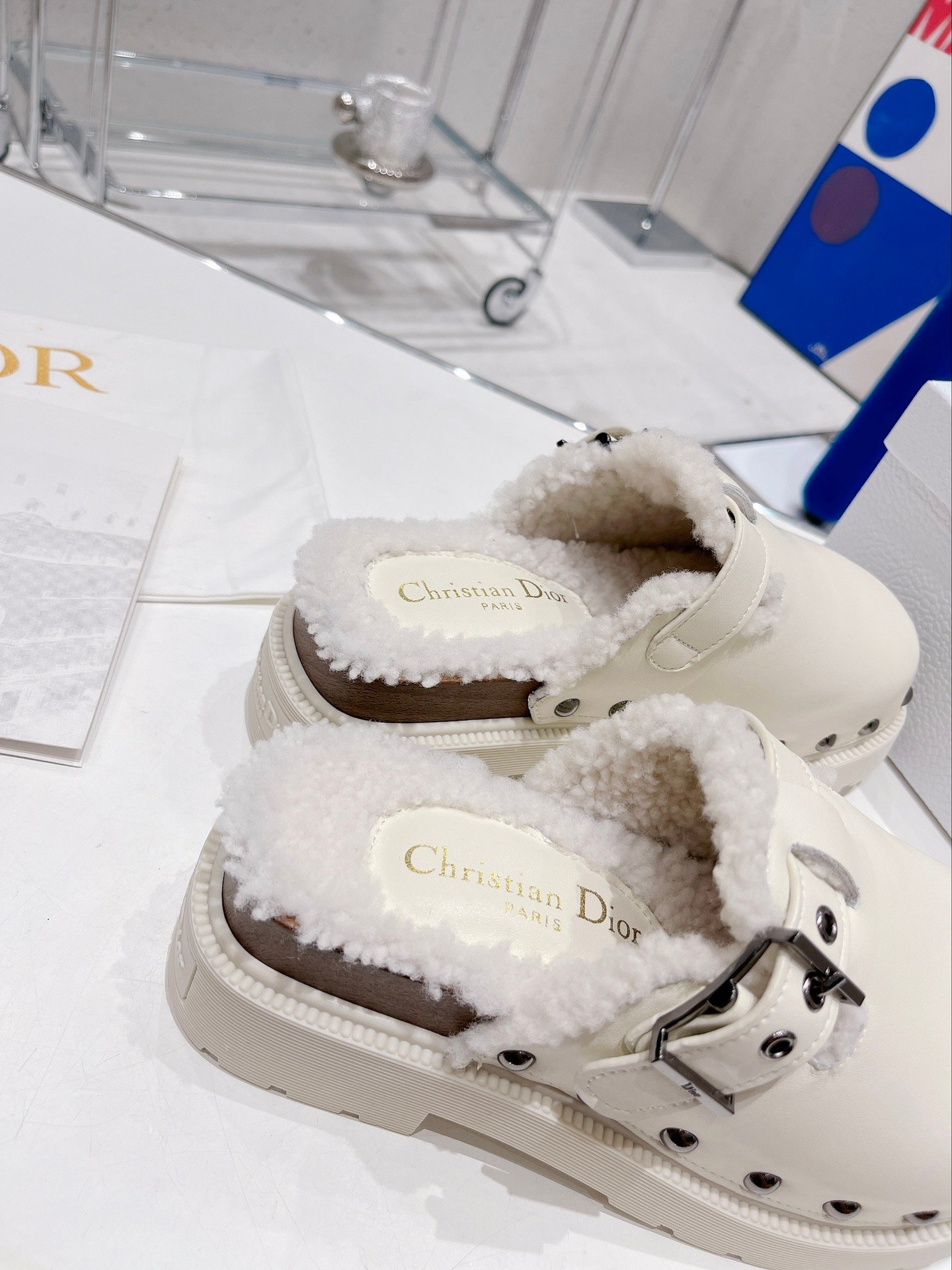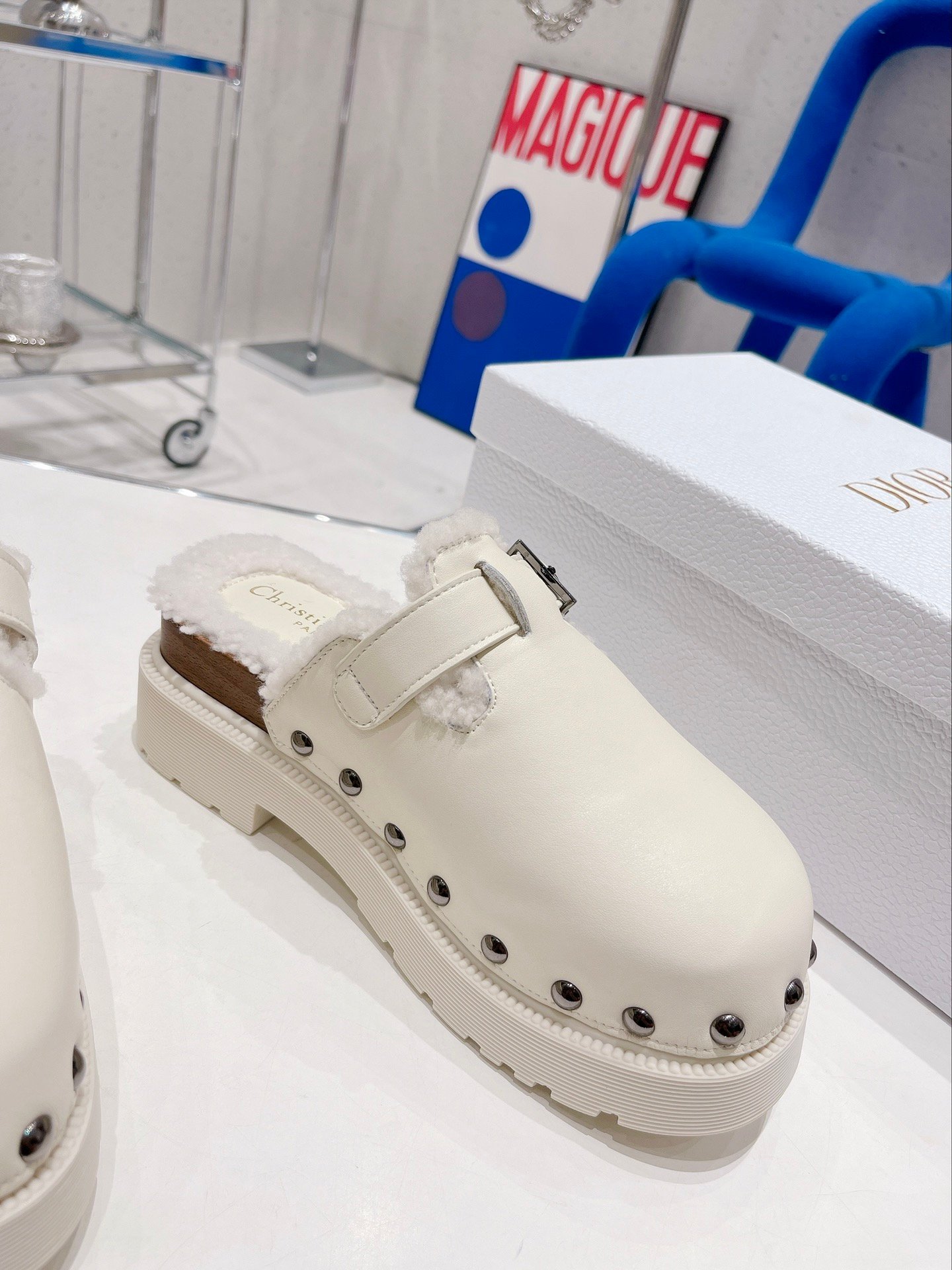 Diorquake 木底鞋由 Maria Grazia Chiuri 设计,以品牌的高级定制精神重新诠释了一款永恒的鞋履。鞋面配有银色饰面“DIOR”雕刻搭扣和铆钉。内部采用羊毛皮制成,混合鞋底上饰有“Christian Dior PARIS”标志。这款木底鞋可搭配高筒袜,打造现代造型。