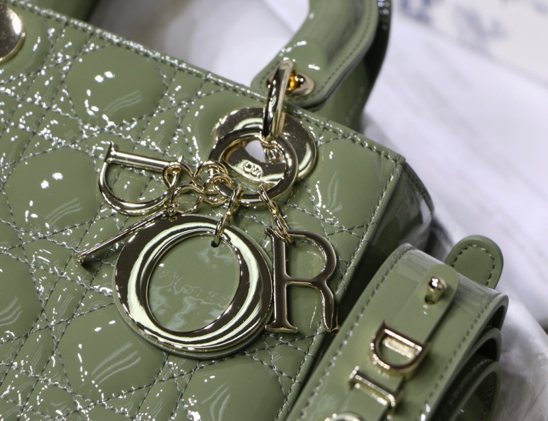 - 详细介绍:此款 Lady Dior 手袋体现了Dior先生对优雅与美丽的真知灼见。时尚柔美的手袋彰显经典而又现代的气质。该手袋采用牛油果绿漆皮牛皮革精制而成,标志性的经典藤格纹图案,尽显精良的缝制工艺。浅金色的标志性“D.I.O.R.”吊饰彰显别致韵味。其肩带最多可添加 6 枚徽章,满足个性化的需求。