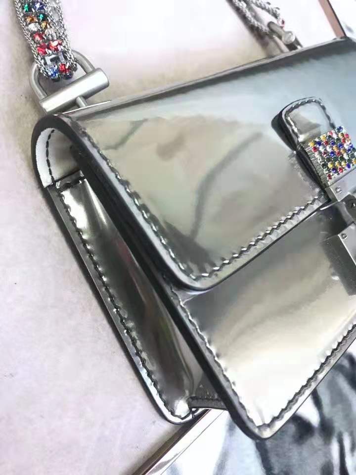 - 详细介绍:Dir.o 小牛皮镜面银灰色链条包,复古的彩钻链条搭配银灰色的镜面 在纯色镜面里,灰色显得简单大方,非常非常美,颜值实在是很高了!!