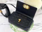 - 详细介绍:这款 Dior Caro 手袋结合典雅气质与现代风范。采用黑色牛皮革精心制作,饰以藤格纹缉面线。材质柔软,翻盖饰以复古金色饰面金属旋钮式“CD”扣环,灵感源自 Christian Dior 香水瓶的封口。中号款式,搭配可拆卸的“CD”标志链条肩带,可手提或肩背,亦可替换成 Dior 的刺绣宽肩带,点缀日常造型或为晚装亮丽点睛。
