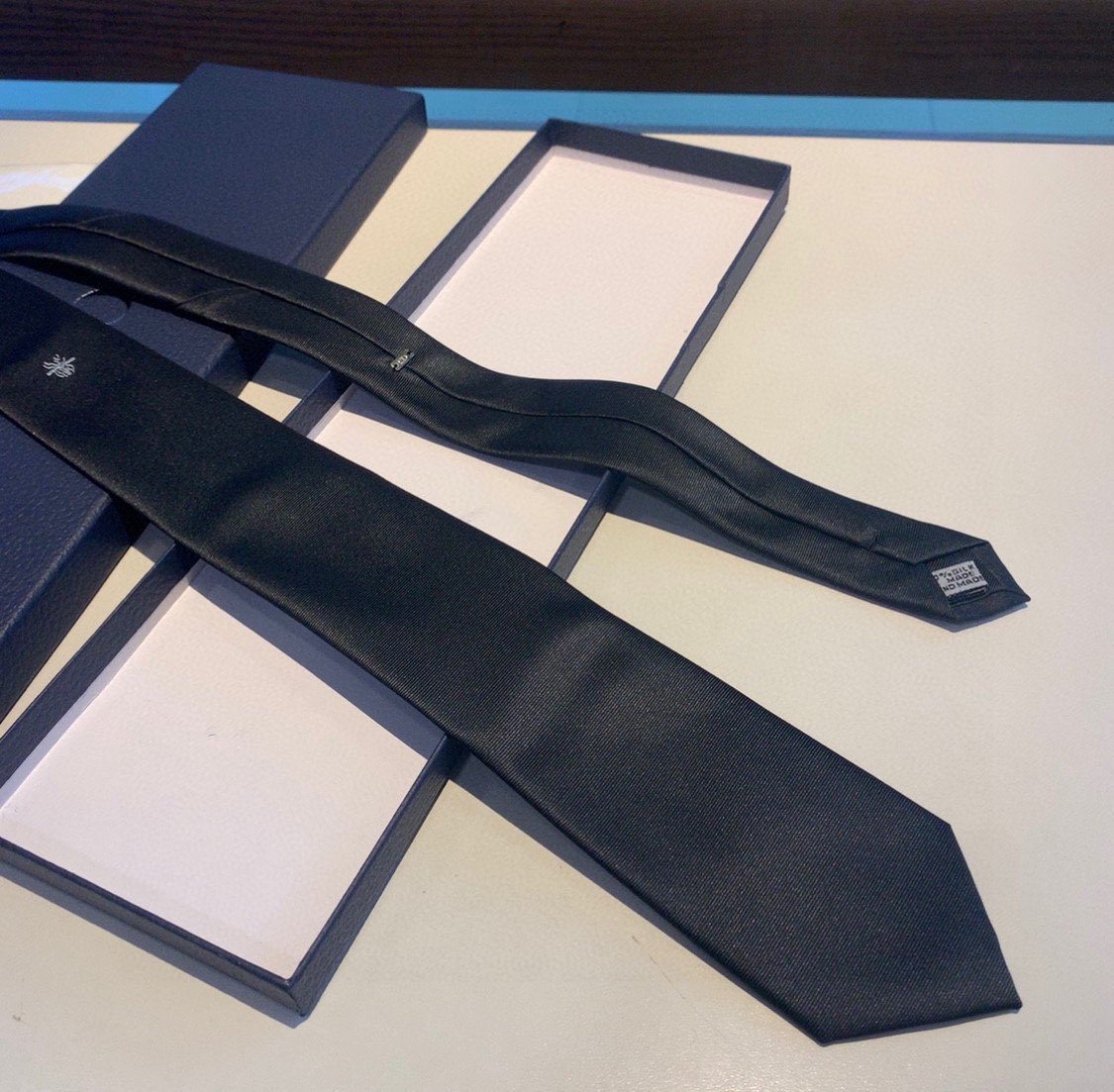 黑色领带结下方饰有标志性的白色蜜蜂提花图案。这款领带采用丝绸精制而成,可为任何西装增添光彩。