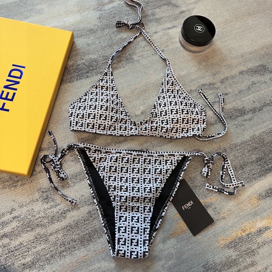 首选泳衣采用轻质泳衣平纹针织面料,时尚又充满夏日气息,采用同色系图案,打造微妙的 F 图案标志性饰面。轻松挂脖三角形状的下装,在颈部和背部用休闲鞋带系紧。