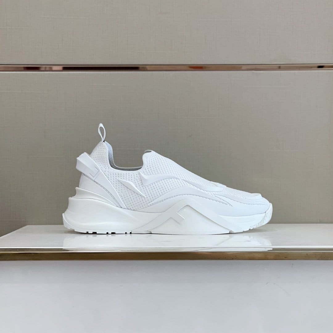 一脚蹬运动鞋,波纹鞋底,鞋跟上刻有 F. FD Fendi Flow 跑步运动鞋字样压花。由网状材料制成。同色系橡胶细节采用创新手工技术装饰。