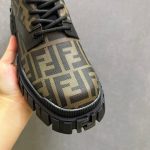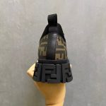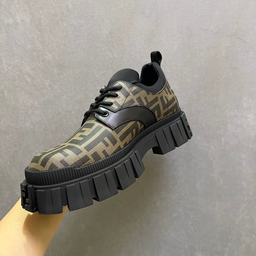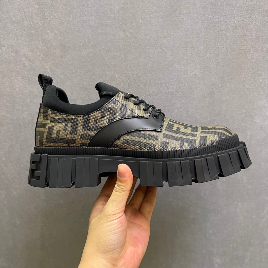 Fendi Force 系带鞋。棕色和黑色 FF 提花面料细节。衣领修剪。浅色橡胶鞋底,后跟处有浮雕 FF 细节。