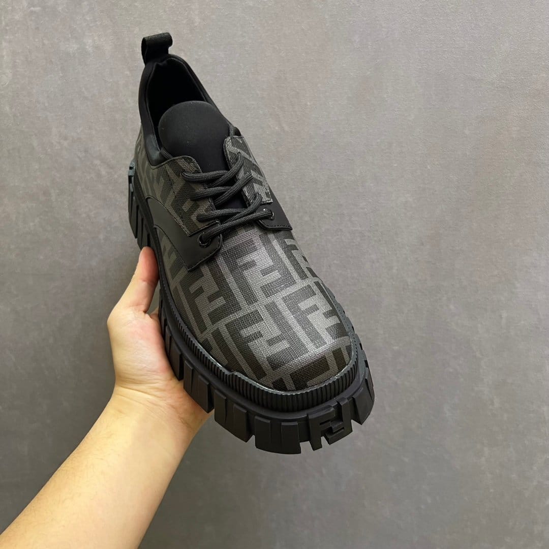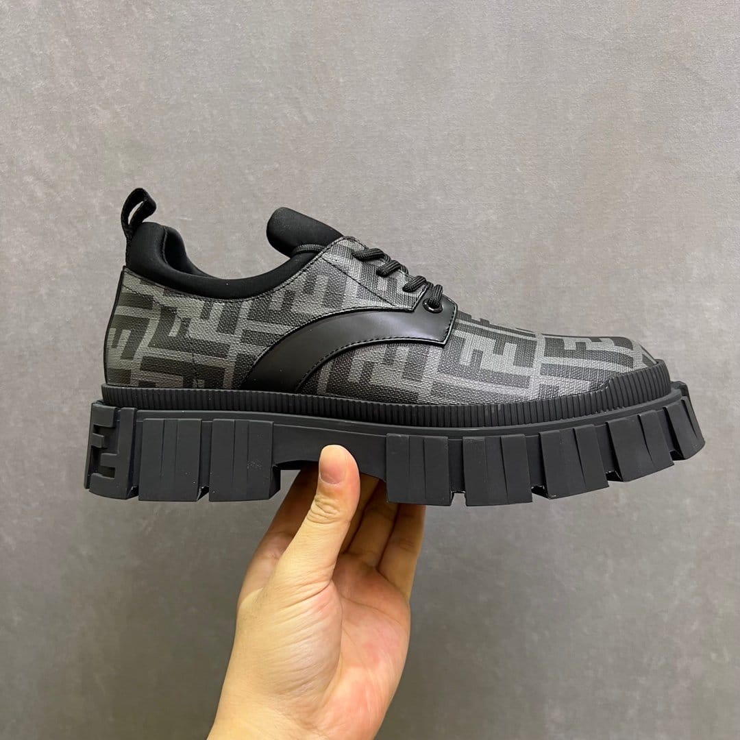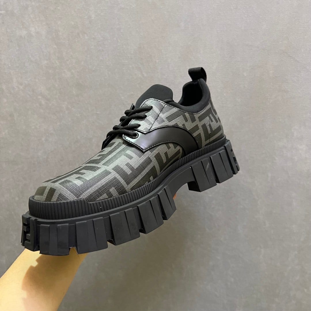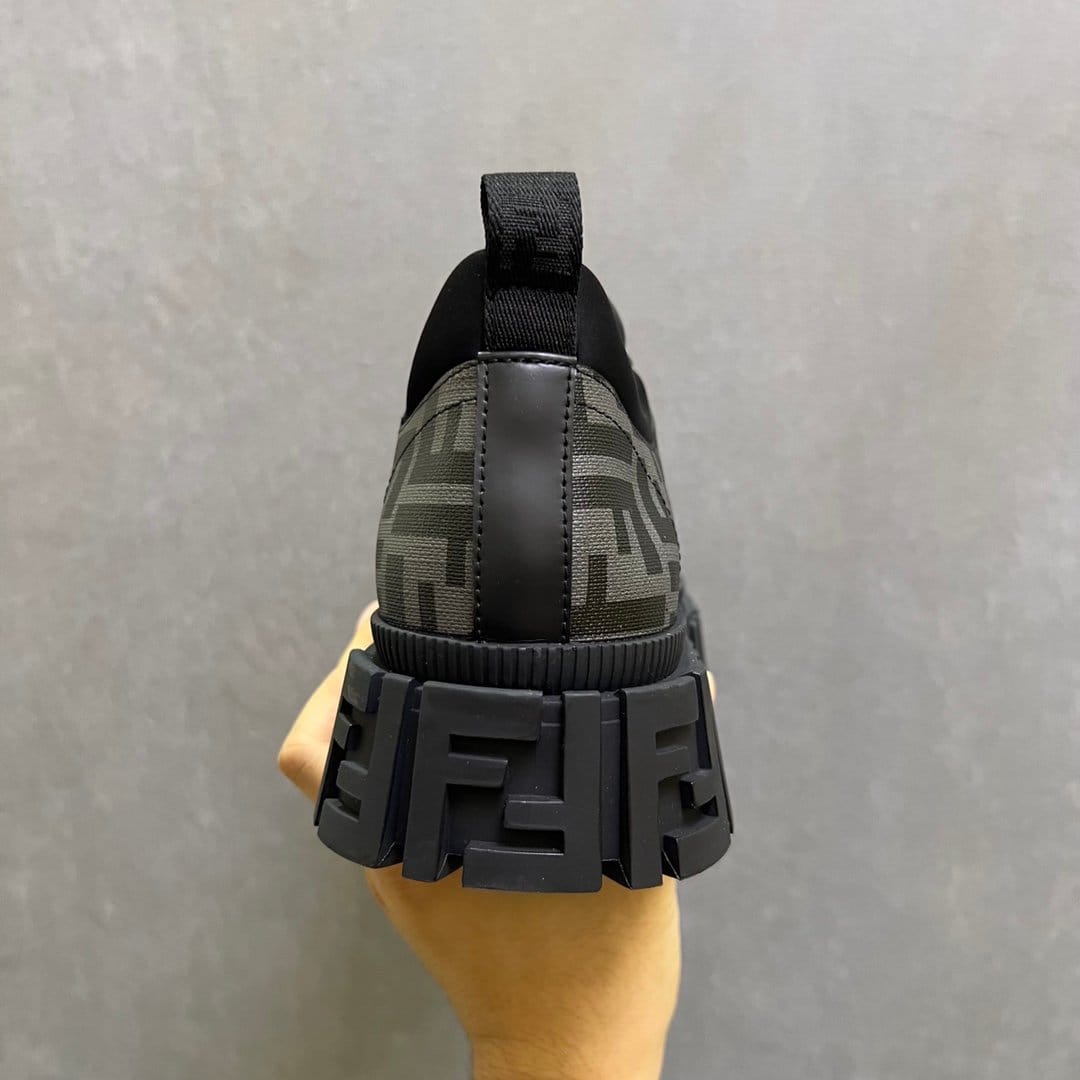 Fendi Force 系带鞋。灰色和黑色 FF 提花面料细节。衣领修剪。轻质橡胶鞋底,后跟处有浮雕 FF 细节。