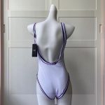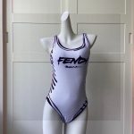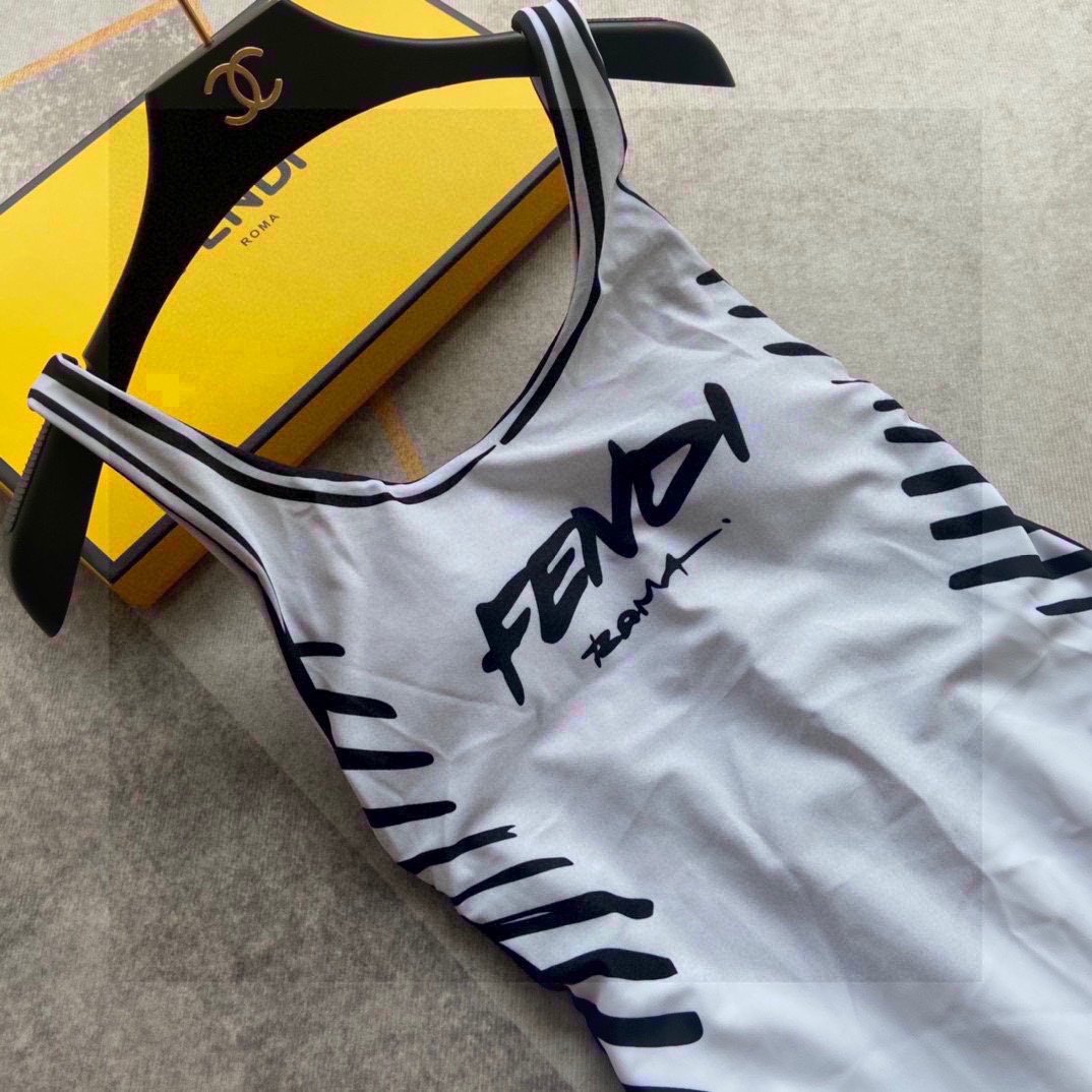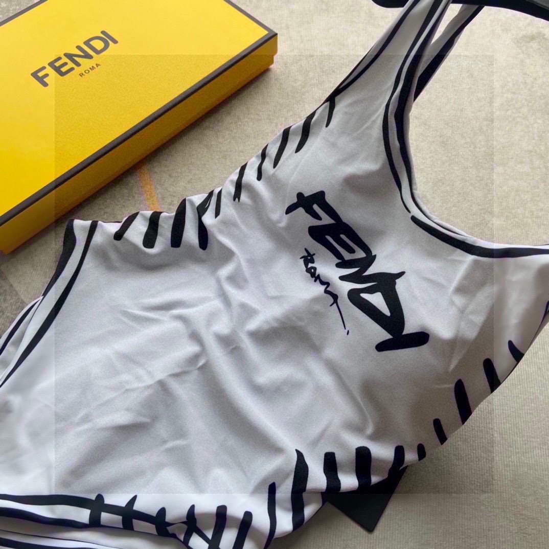Fendi’s one-piece bathing suit with white color is the main tone of Fendi lettering with black lettering effect, low slit on the back.
