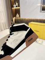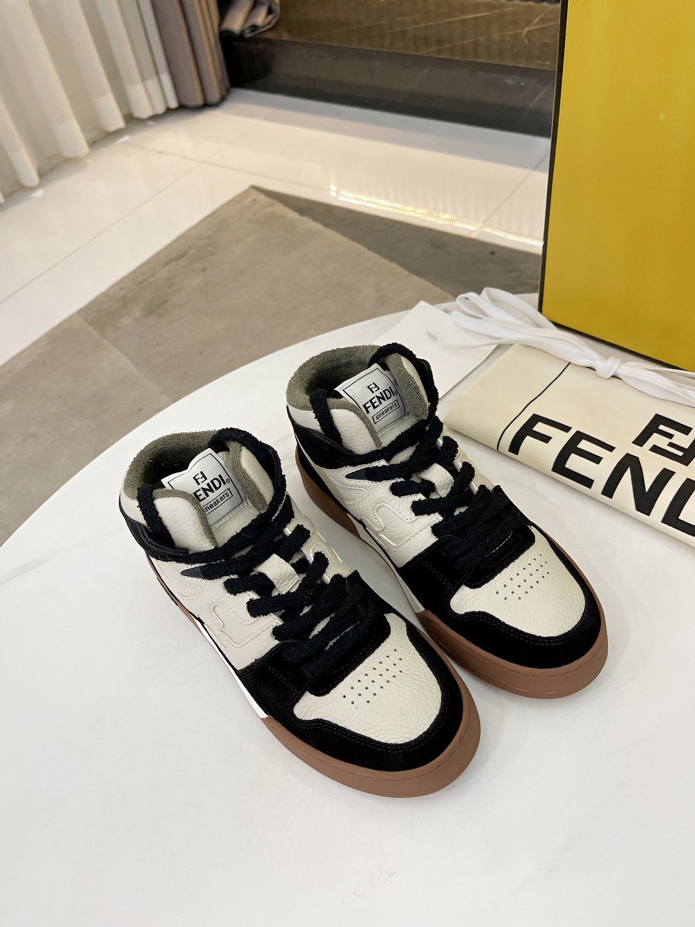 Fendi Match 紧凑设计运动鞋,鞋舌上饰有复古标签。侧面缝有 FF 图案,鞋底压纹 Fendi 字样。饰有黑色毛圈衣领和鞋带。包覆橡胶鞋底,带有棕色缓冲垫。该款式包括第二对白色毛圈花边。