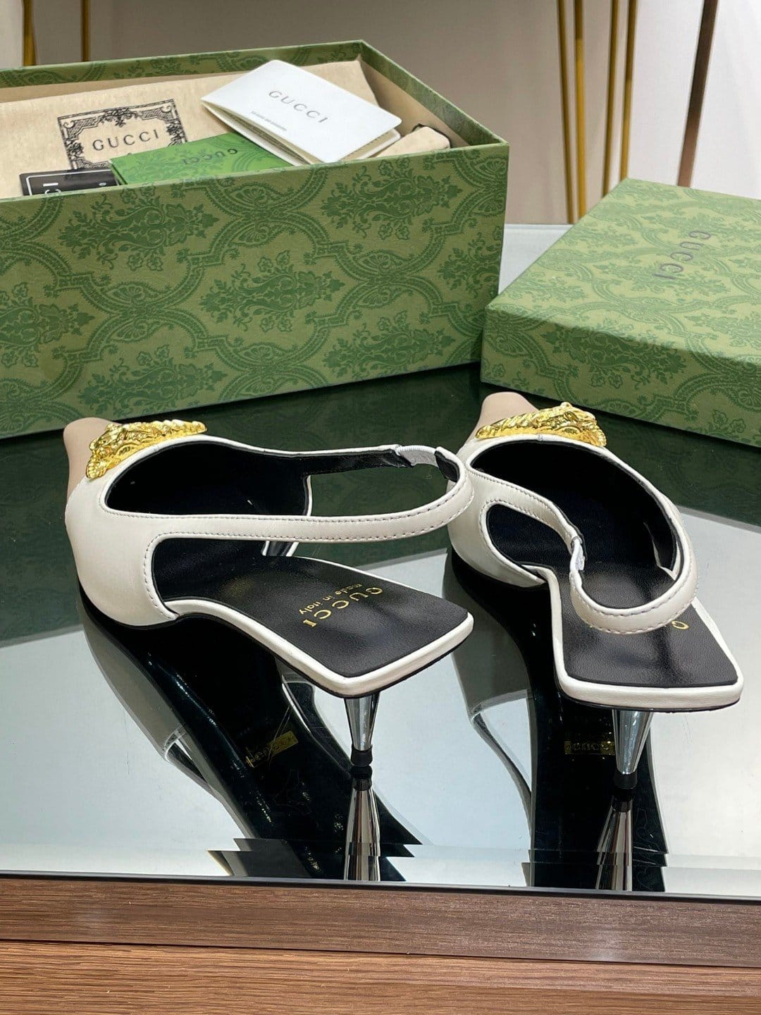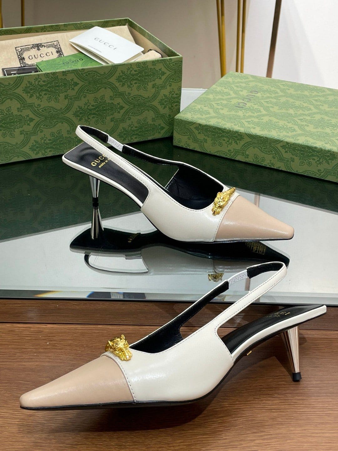 反映图案的历史起源。几十年来,设计硬件的金色调在每个系列中脱颖而出。在这里,这双中跟露跟高跟鞋呈现出现代风格,添加了以下元素。