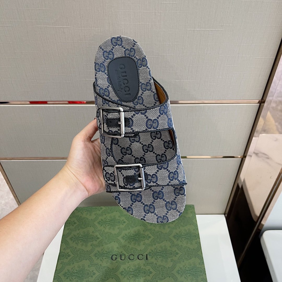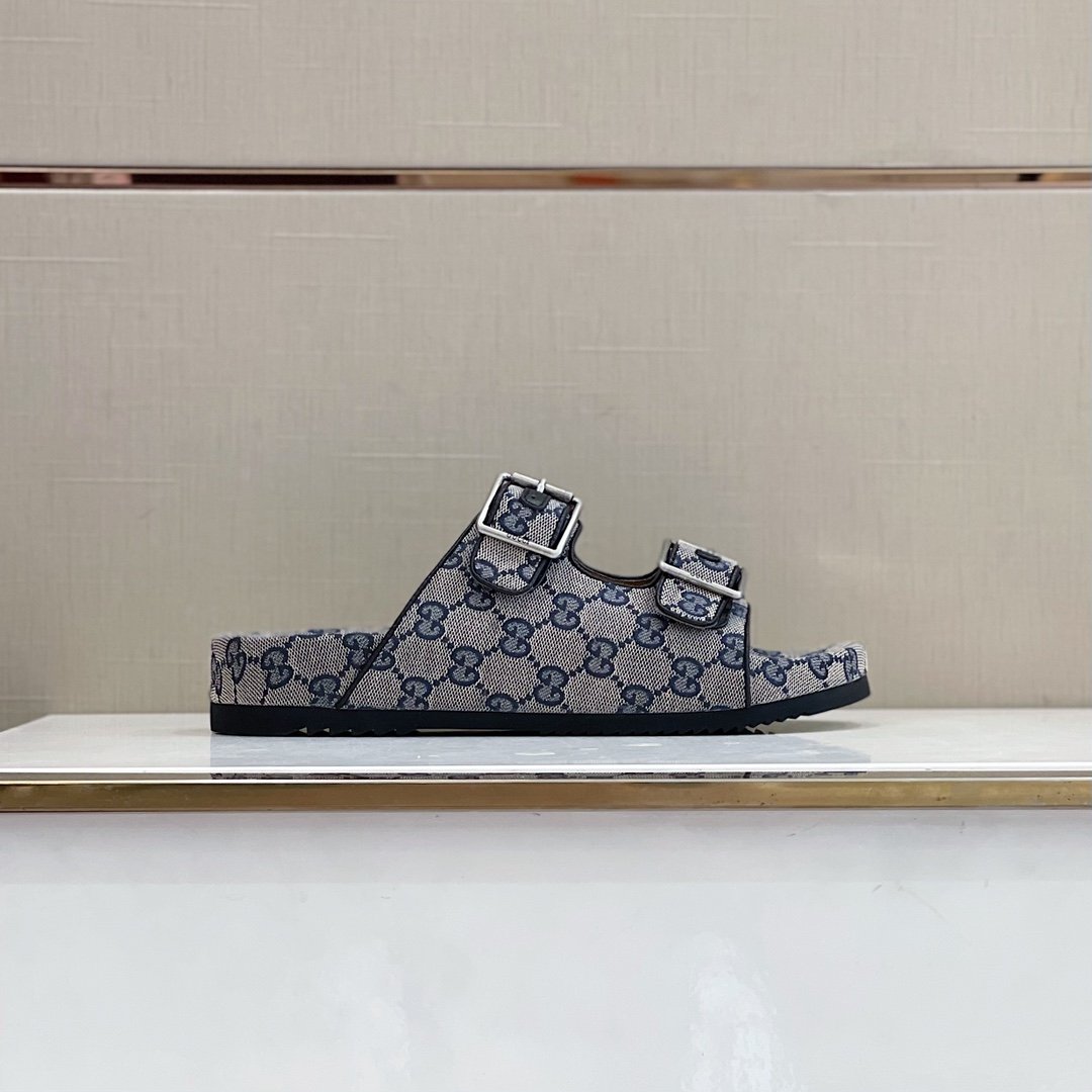 一双平底凉鞋,采用灰色花押字帆布制成。 GG 标志首次使用于 1970 年代,是 1930 年代原始 Gucci 菱形设计的演变,从那时起,它就成为 Gucci 传统的既定象征。