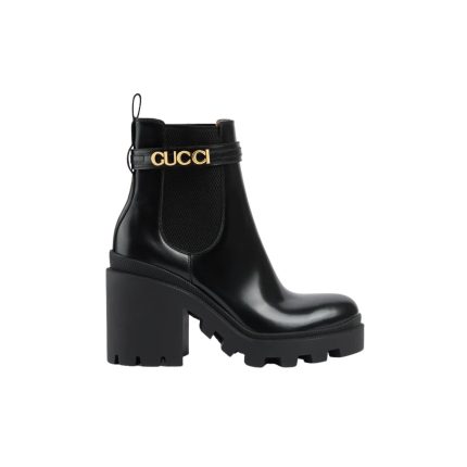 这款女式踝靴采用黑色皮革制成,正面饰有醒目的 Gucci 字样徽标细节。凸纹橡胶鞋底和侧面拉链闭合使风格更加休闲。