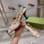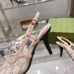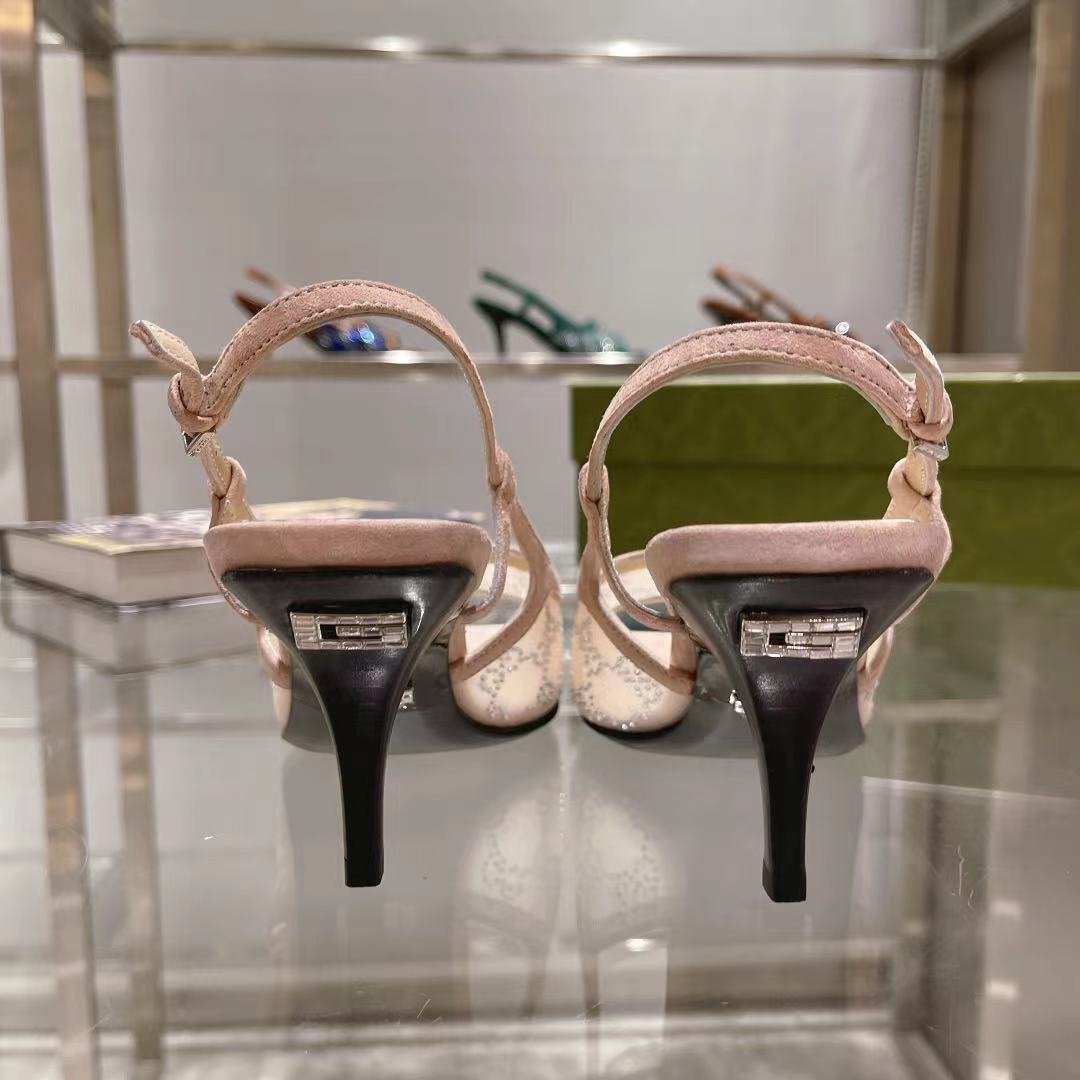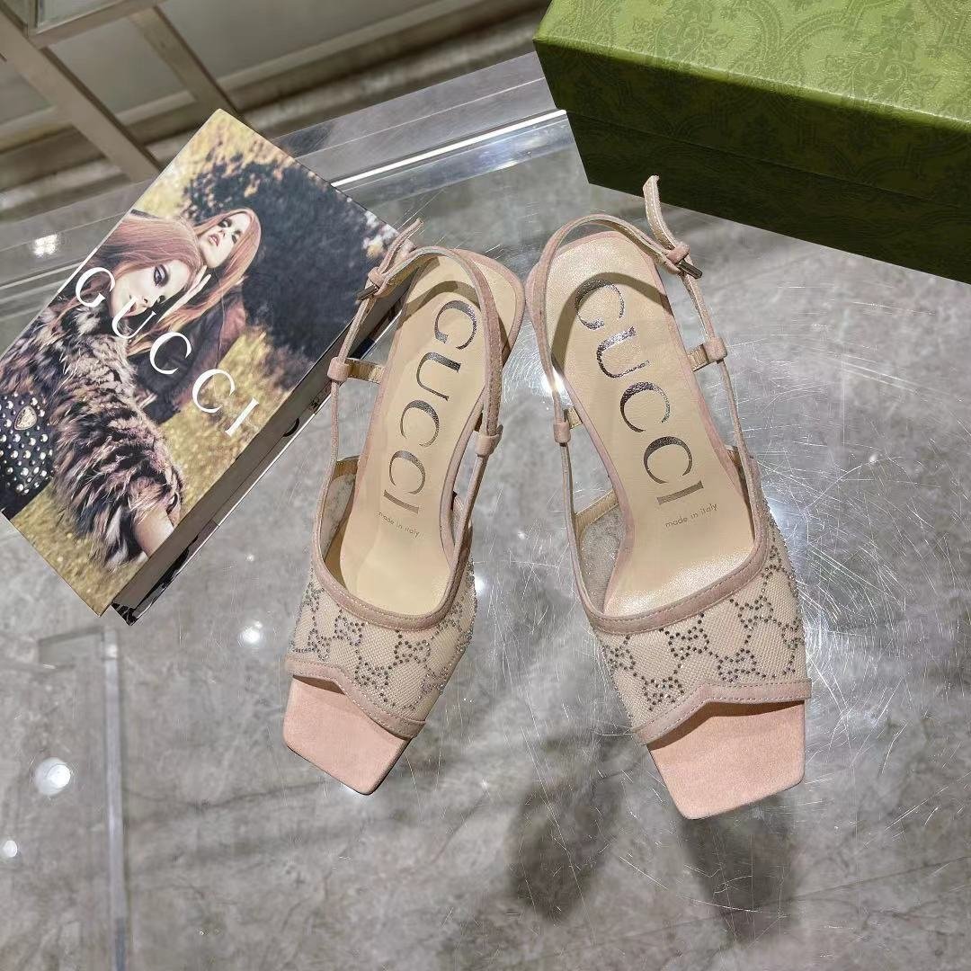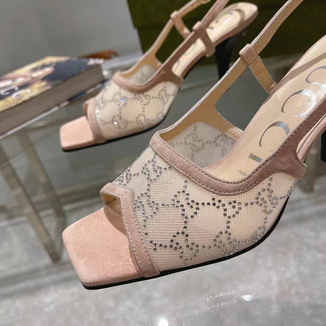 Gucci Aria 系列借鉴了 90 年代和 2000 年代初期的档案,其中的单品灵感来自 Tom Ford 时代在古驰。女性气质的新理念展现了迷人的细节,如蕾丝、水晶和透明面料。这双露跟中跟鞋采用米色网布,饰有闪亮的 GG 图案。