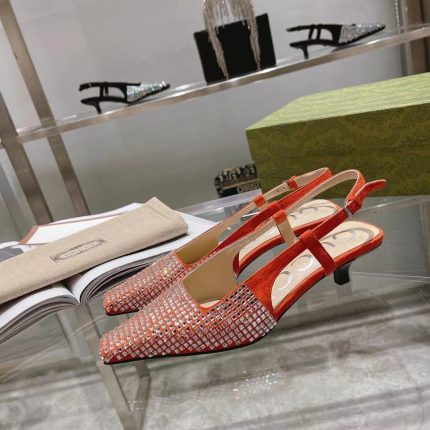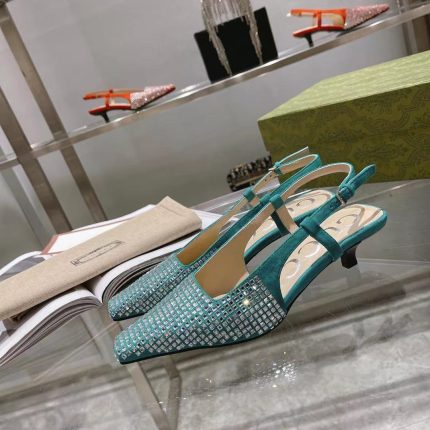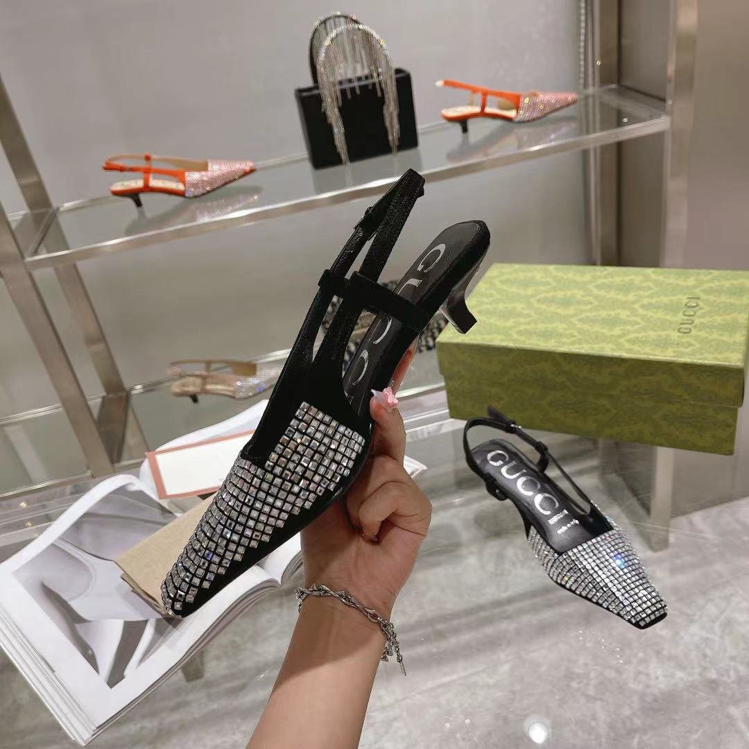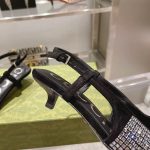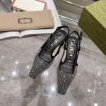 Gucci Aria 系列借鉴了 90 年代和 2000 年代初期的档案,其中的单品灵感来自 Tom Ford 的 Gucci 时代。女性气质的新理念展现了迷人的细节,如蕾丝、水晶和透明面料。这双露跟鞋采用黑色帆布制成,饰有闪亮的 GG 图案。