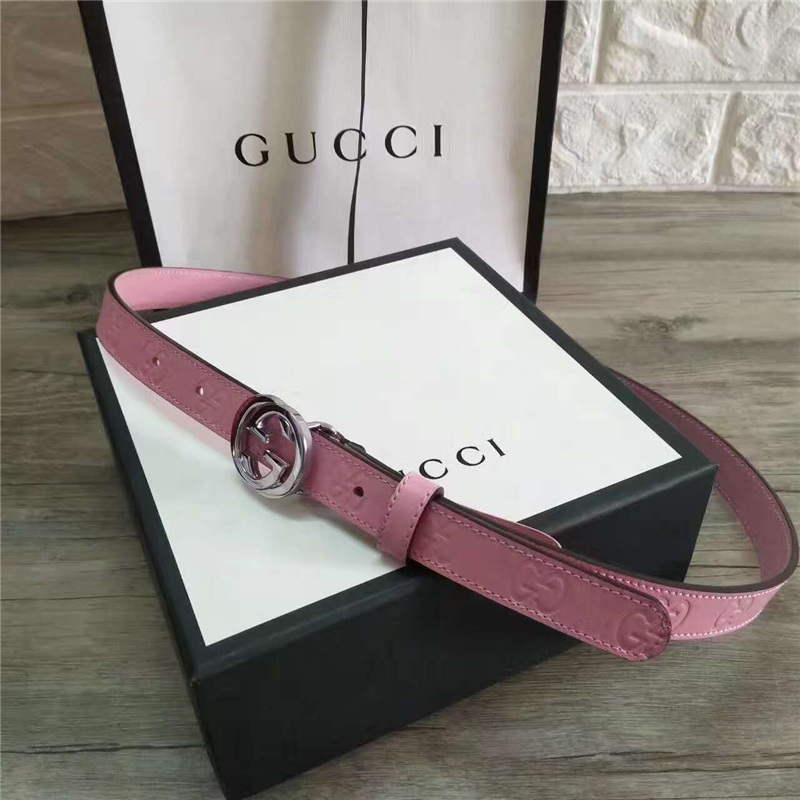 Gucci 新款 进口原版小牛皮压花 女士腰带 双G扣头 双面可用 粉色银扣